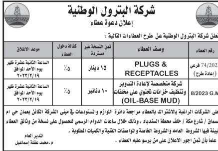 عطاءات صادرة عن شركة البترول الوطنية
