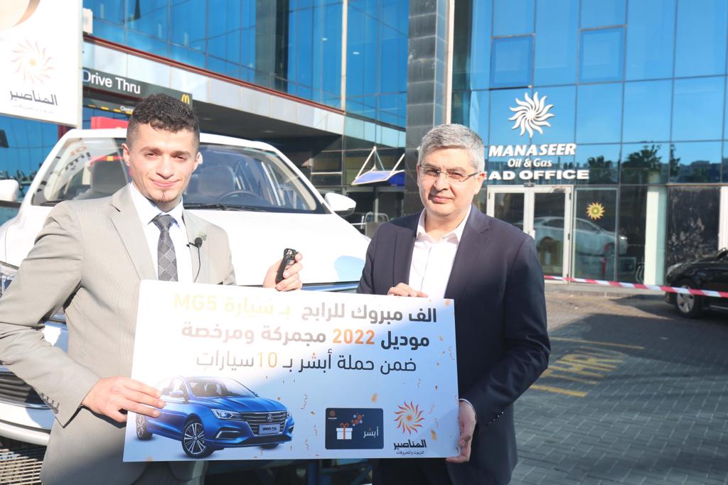 عمون - قام نائب المدير العام لشركة المناصير للزيوت والمحروقات الدكتور رامز خوري بتسليم مفاتيح سيارات MG5 مجمركة ومرخصة للرابح التاسع السيد عامر احمد سلهب وللرابح العاشر ليث محمد الحياري ضمن احتفالات أبشر بعيدها الثالث والتي قدمت لعملائها 10 سيارات لـ 10 رابحين من نوع MG5 مجمركة ومرخصة من خلال سحب شهري على أرقام بطاقات أبشر الفعالة.