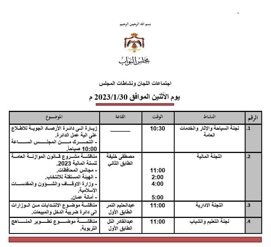 وكما تناقش اللجنة الإدارية موضوع الانتدابات من الوزارات إلى دائرة ضريبة الدخل والمبيعات، فيما تناقش لجنة التعليم والشباب موضوع تطوير المناهج التربوية.