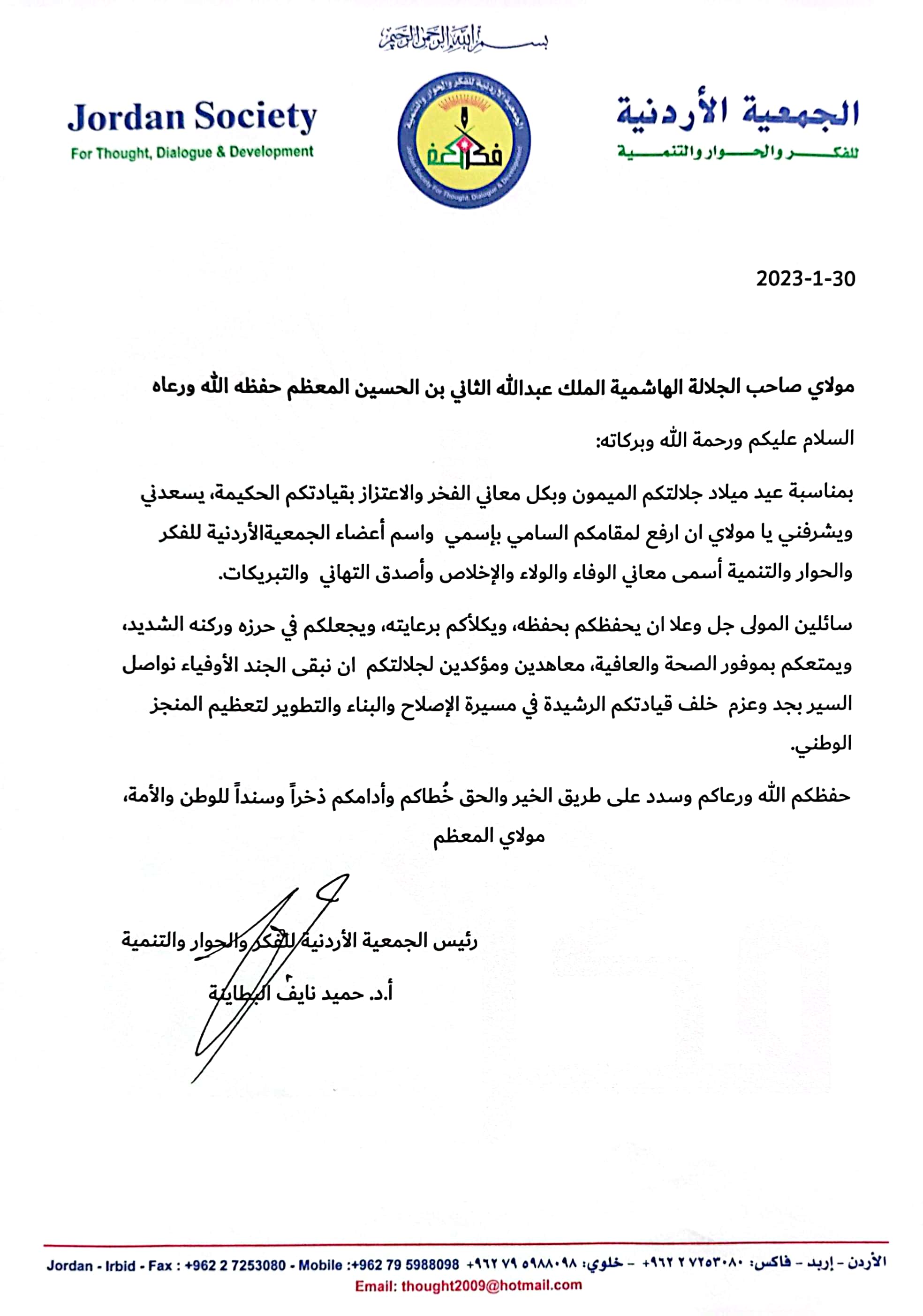 عمون - هنأ رئيس الجمعية الاردنية للفكر والحوار والتنمية أ.د. حميد نايف البطاينة باسمه وأعضاء الجمعية، جلالة الملك عبدالله الثاني، بمناسبة عيد ميلاده الحادي والستين. |