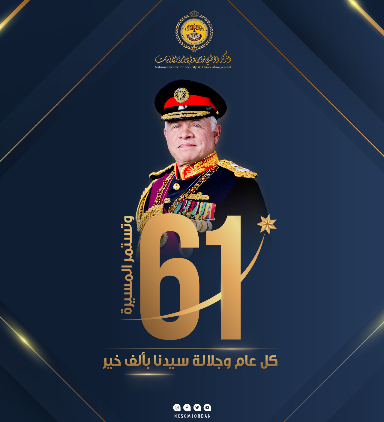 عمون - يرفع المركز الوطني للأمن وإدارة الأزمات إلى مقام حضرة صاحب الجلالة الهاشمية الملك عبدالله الثاني بن الحسين المعظم، أطيب آيات التهنئة والتبريك بمناسبة عيد ميلاده الحادي والستين، داعين الباري عز وجل أن يعيده على جلالته بموفور الصحة والعافية، وعلى الأسرة الأردنية بدوام الرفعة والازدهار. |