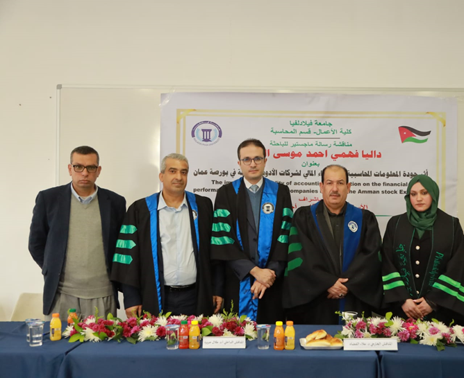 الرسالة الثالثة بعنوان: أثر جودة المعلومات المحاسبية على الأداء المالي لشركات الأدوية المدرجة في بورصة عمان، والمقدّمة من الطالبة داليا فهمي أحمد الزغول بإشراف الأستاذ الدكتور قاسم العواقلة، وتكونت لجنة المناقشة من: الدكتور علاء القضاة مناقشًا خارجيًا، والأستاذ الدكتور طلال جريرة مناقشًا داخليًا.