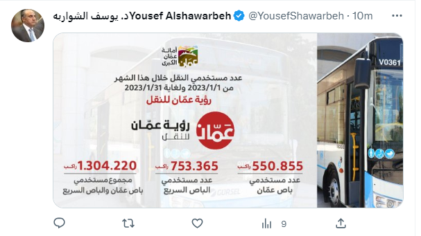 عمون - نشر امين عمان الدكتور يوسف الشواربة، عبر تويتر، مساء الثلاثاء، صورة تظهر عدد مستخدمي الباص السريع وباص عمان خلال كانون الثاني الحالي. |
