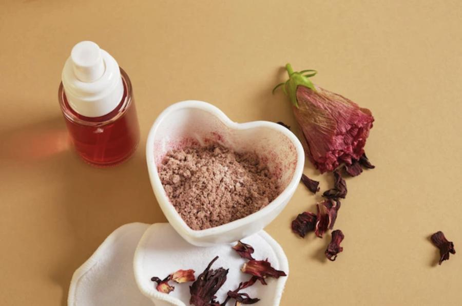 - في وعاء صغير، قم بمزج كمية متساوية من مسحوق النشا ومسحوق الكركديه.
