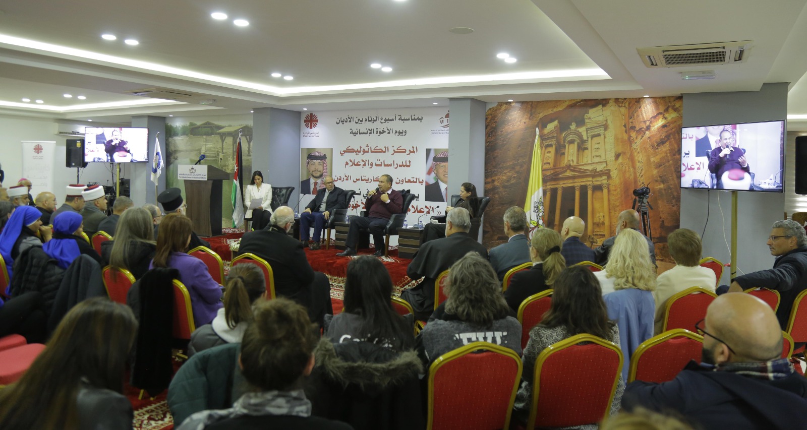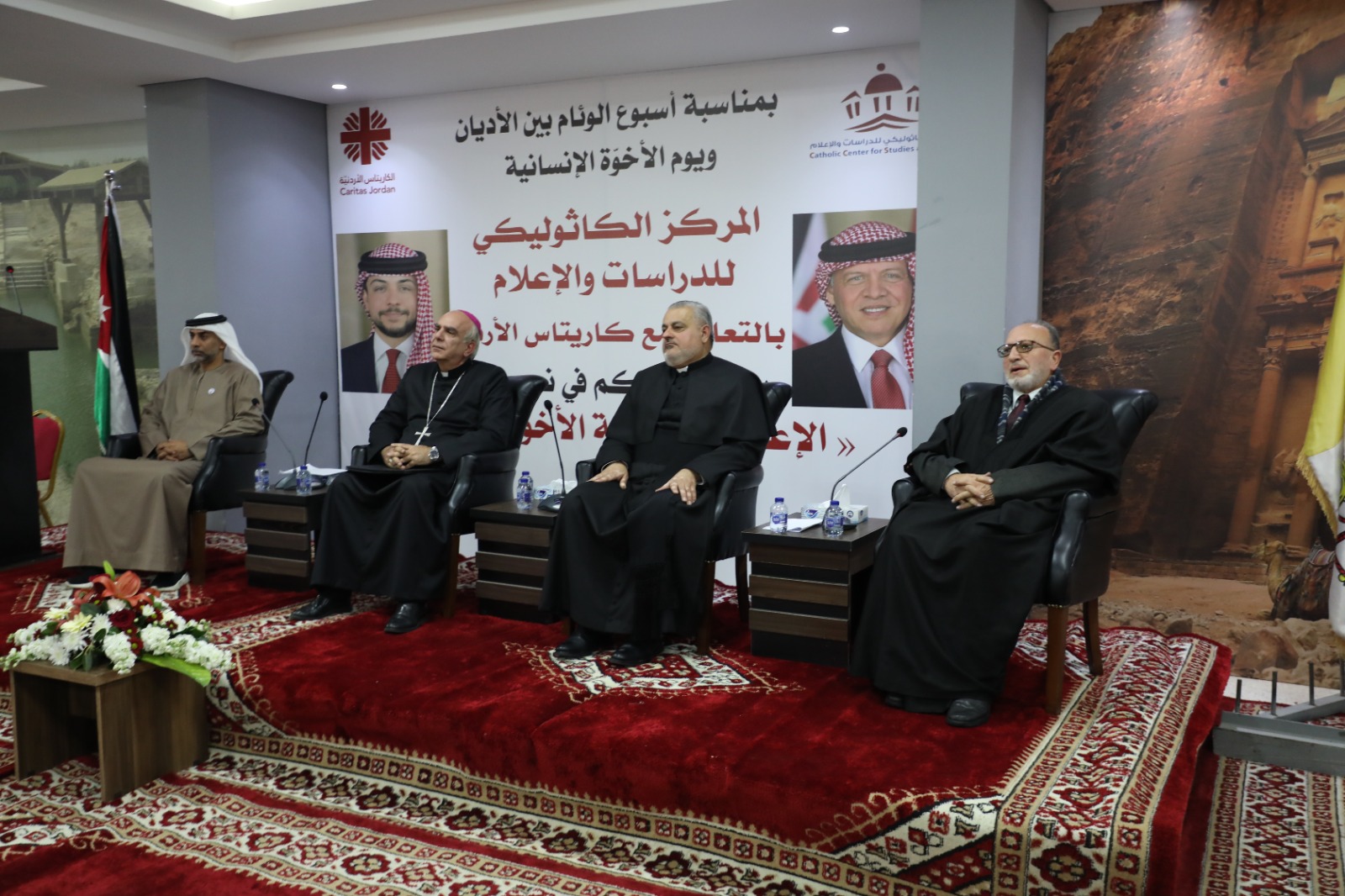 عمون - أقام المركز الكاثوليكي للدراسات والإعلام، بالتعاون مع كاريتاس الأردن، صباح اليوم السبت، ندوة احتفاليّة أحيا خلالها اليوم الدولي للأخوّة الإنسانيّة الذي يحتفل به في الرابع من شباط، وأسبوع الوئام بين الأديان الذي يحتفل به في الأسبوع الأوّل من شباط، بعنوان: "دور وسائل الإعلام في خدمة الأخوّة الإنسانيّة"، وذلك في قاعة كرم امسيح ، قرب كنيسة قلب يسوع في تلاع العلي.