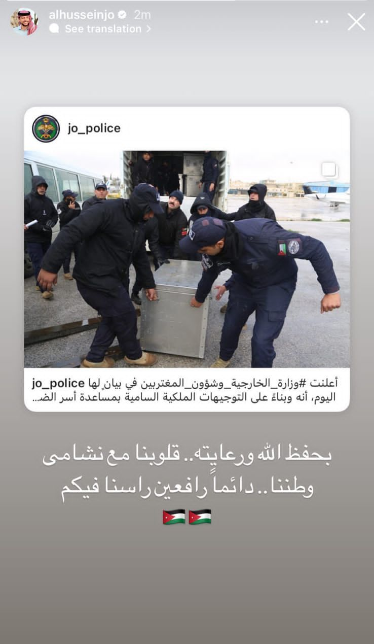ونشر سمو ولي العهد، عبر خاصية "ستوري انستغرام"، “بحفظ الله ورعايته، قلوبنا مع نشامى وطننا.. دائما رافعين راسنا فيكم”.