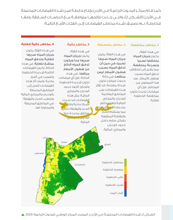 وبحسب الاستراتيجية، فإن مركز البحوث الزراعية في الأردن قام بإنتاج خارطة تبين شدة الفيضانات المحتملة في الأردن، والتي جاءت متوافقة مع الدراسات السابقة.