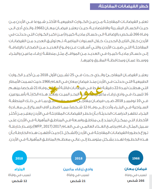 وأوضحت، أن الفيضــان المفاجــئ الــذي حــدث فــي 25 تشــرين الأول 2018 يعد مــن أكبــر الكــوارث الطبيعيـة التـي حدثـت فـي الأردن منـذ فيضان معان فـي العـام 1966، حيث تسـببت الأمطار التـي هطلـت لمـدة 22 دقيقـة فقـط فـي فيضانـات قاتلـة أدت إلـى وفـاة 21 شـخصا، بينهـم 16 تلميــذا، فــي وادي زرقــاء ماعيــن بمنطقــة البحــر الميــت.