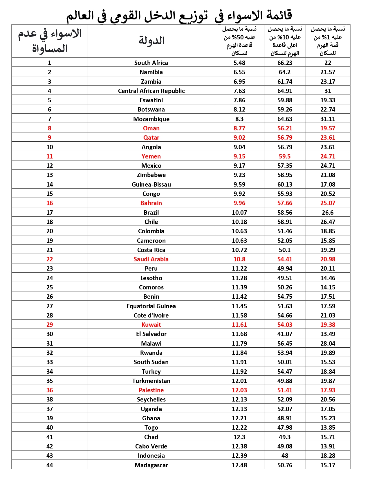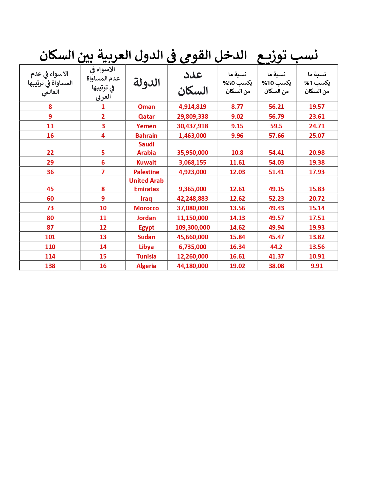 اما فيما يتعلق في اللامساواة في توزيع الدخل القومي للدول العربية، فالجدول ادناه يبين ان ما نسبته 1% من عدد السكان في العالم العربي يكسبون ما نسبته 18% من الدخل القومي، وطبعا تتفاوت هذه النسبة حسب البلد ، و10% يكسبون ما معدله نسبة 51%، واما الفقراء التي تتراوح نسبتهم 50% من عدد السكان يكسبون فقط 13% .