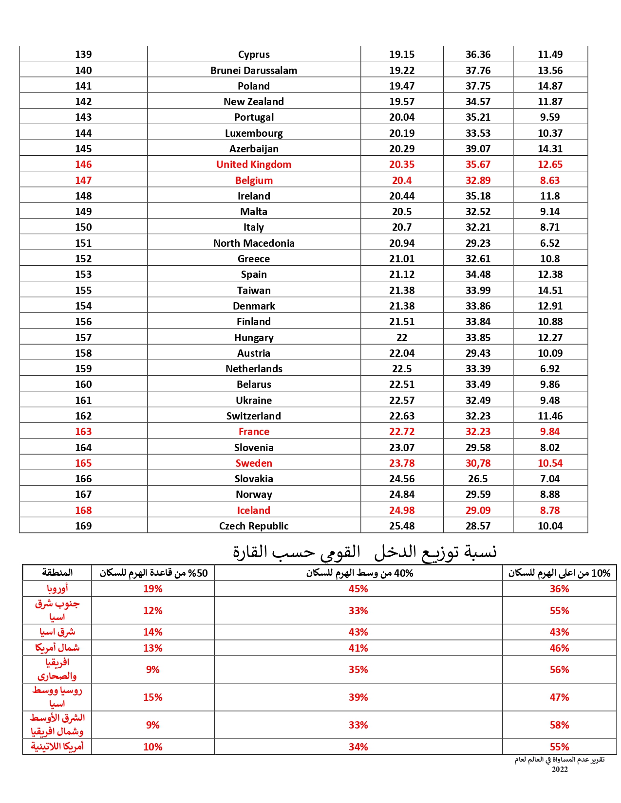 واما نسبة توزيع الدخل القومي في القارات، فيبين ان الأسوأ في عدالة التوزيع هي دول الشرق الأوسط وشمال افريقيا حيث يحصل 50% من السكان على ما نسبته 9% فقط من مجمل الدخل القومي العربي، بينما 10% من السكان يحصلون على 58% من الدخل القومي.