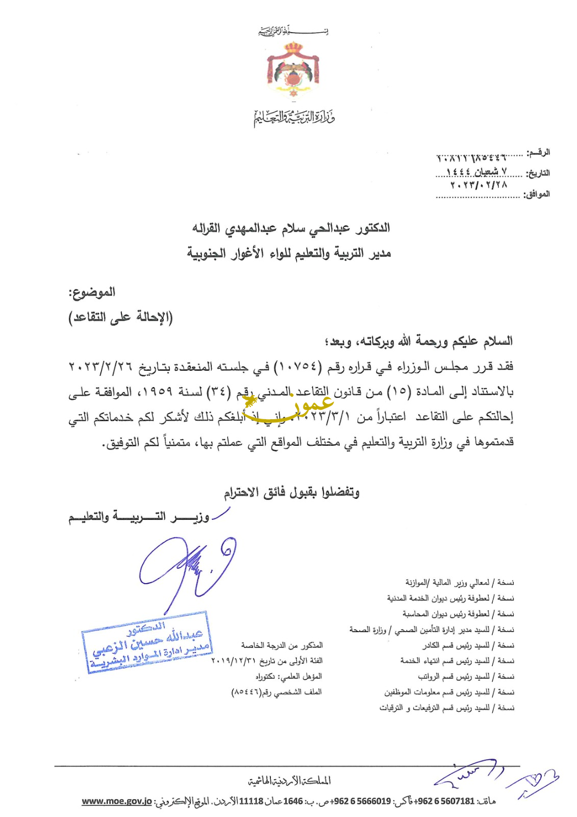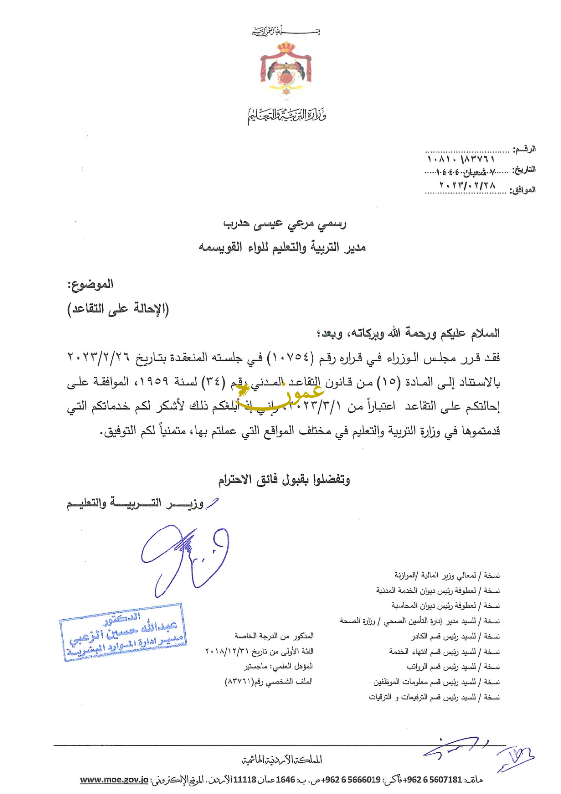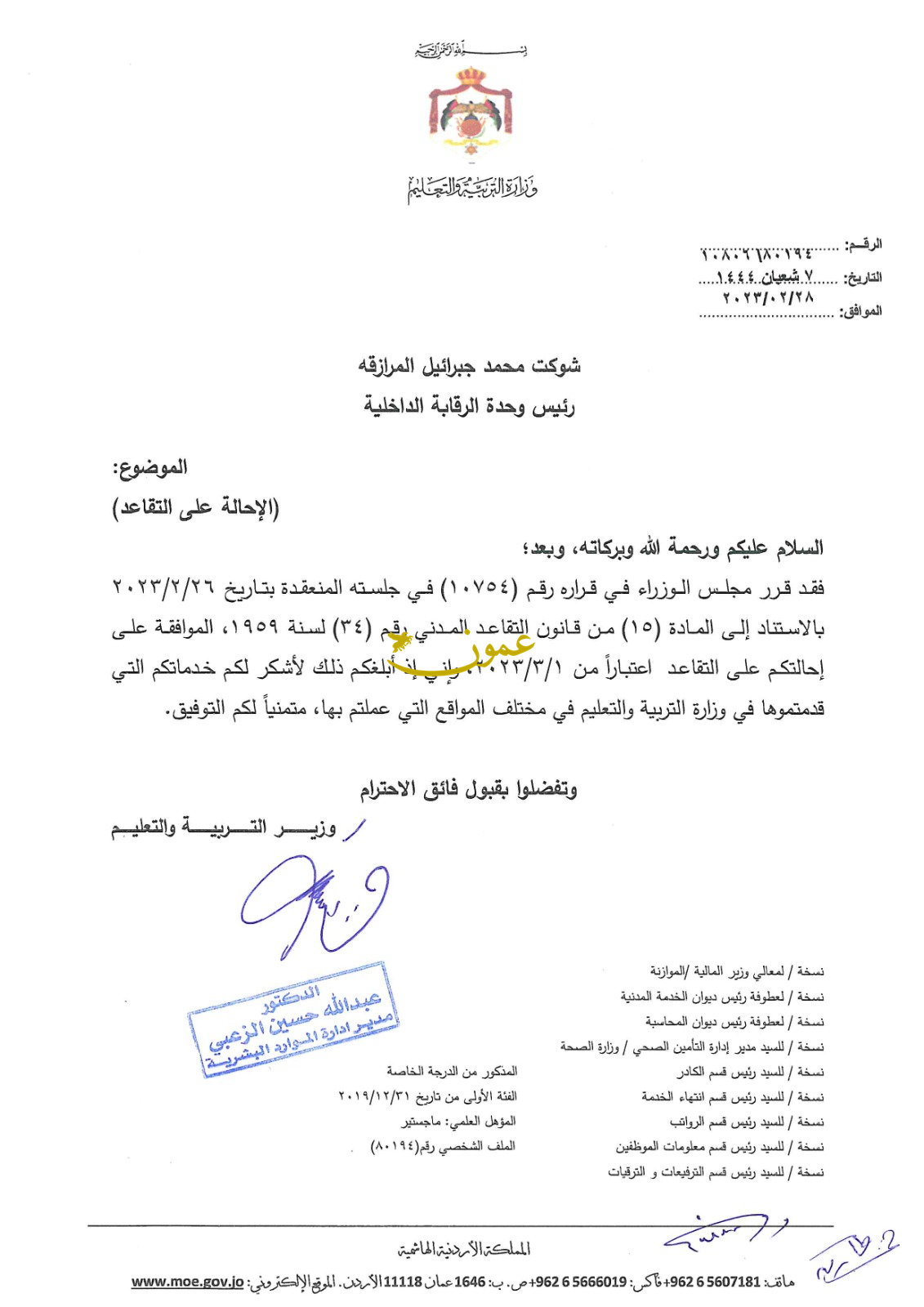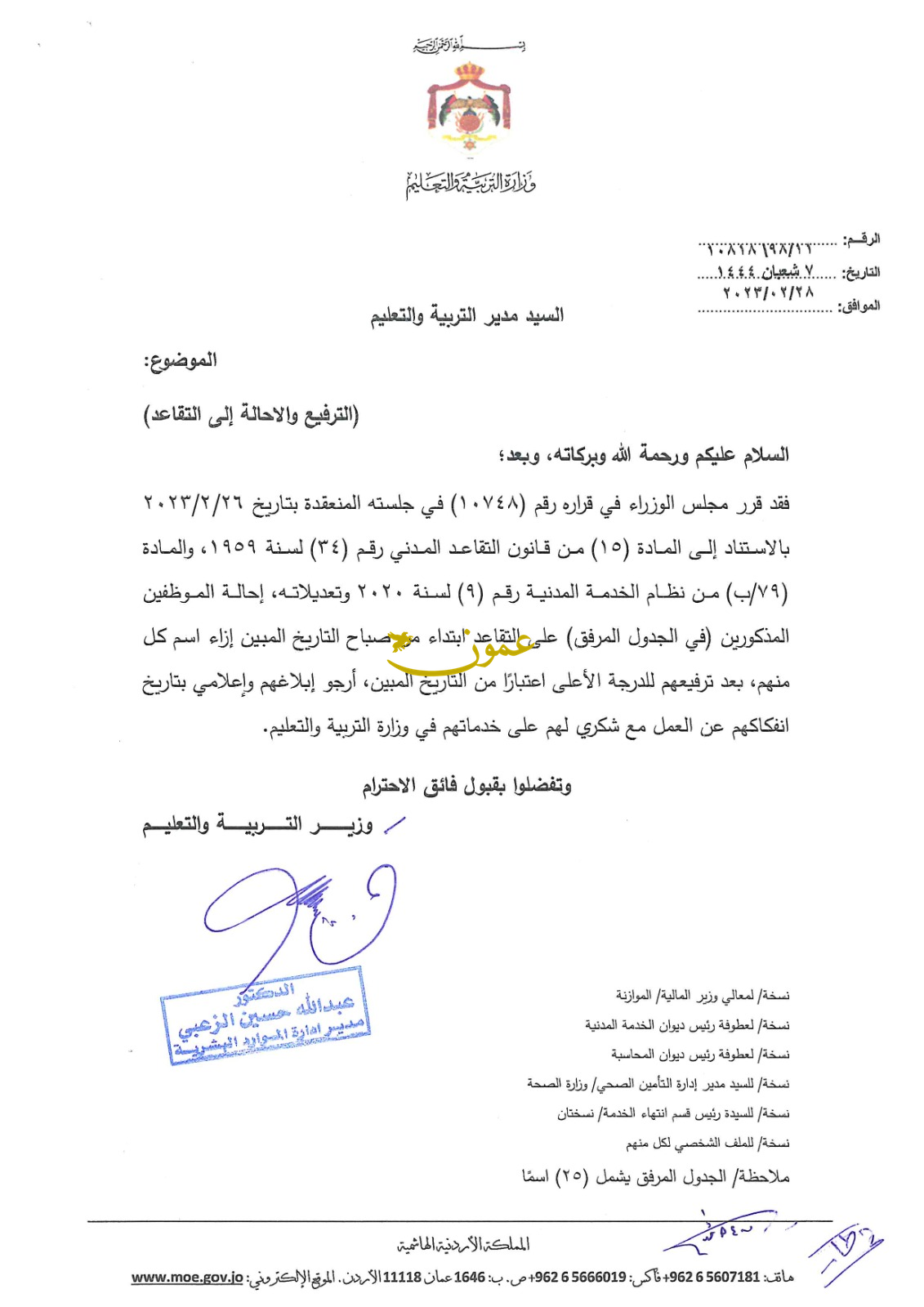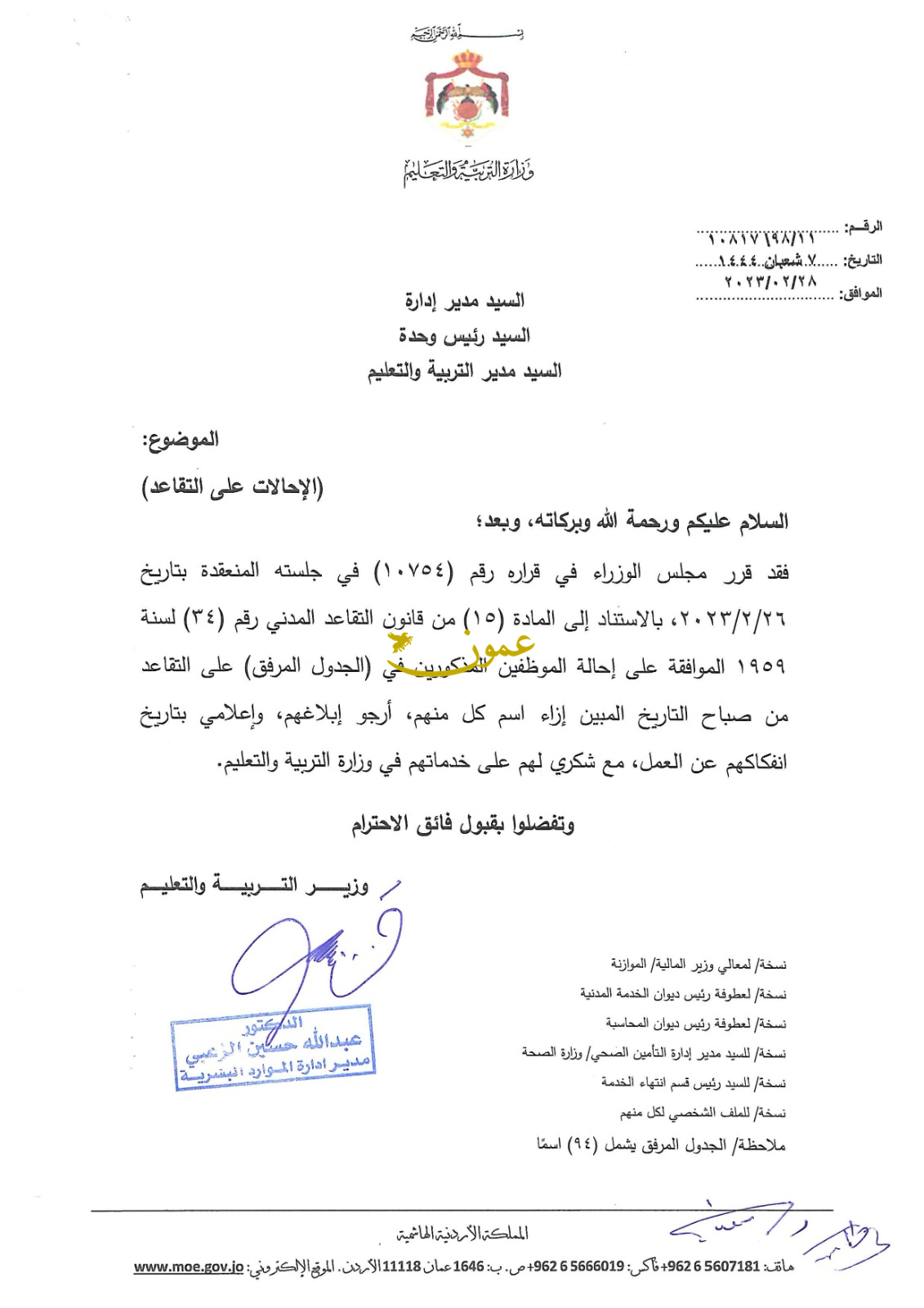 عمون - قرر مجلس الوزراء مؤخرا الموافقة على إحالة عدد من المدراء في وزارة التربية والتعليم إلى التقاعد.