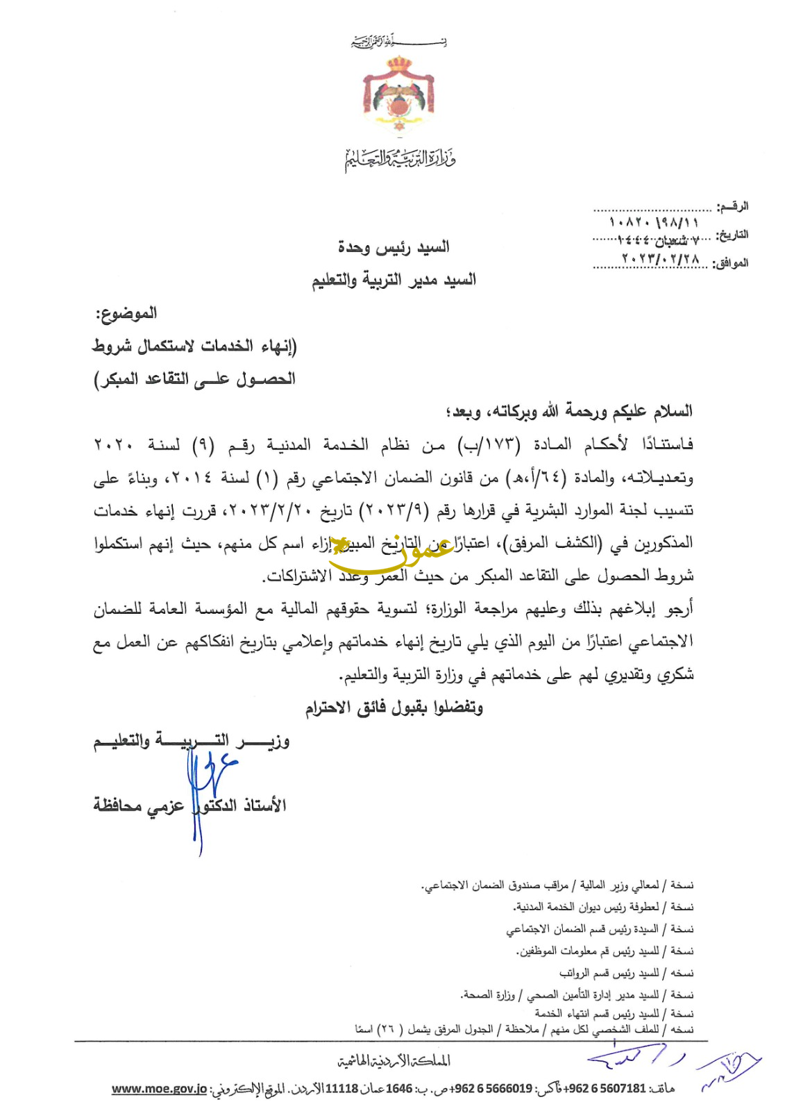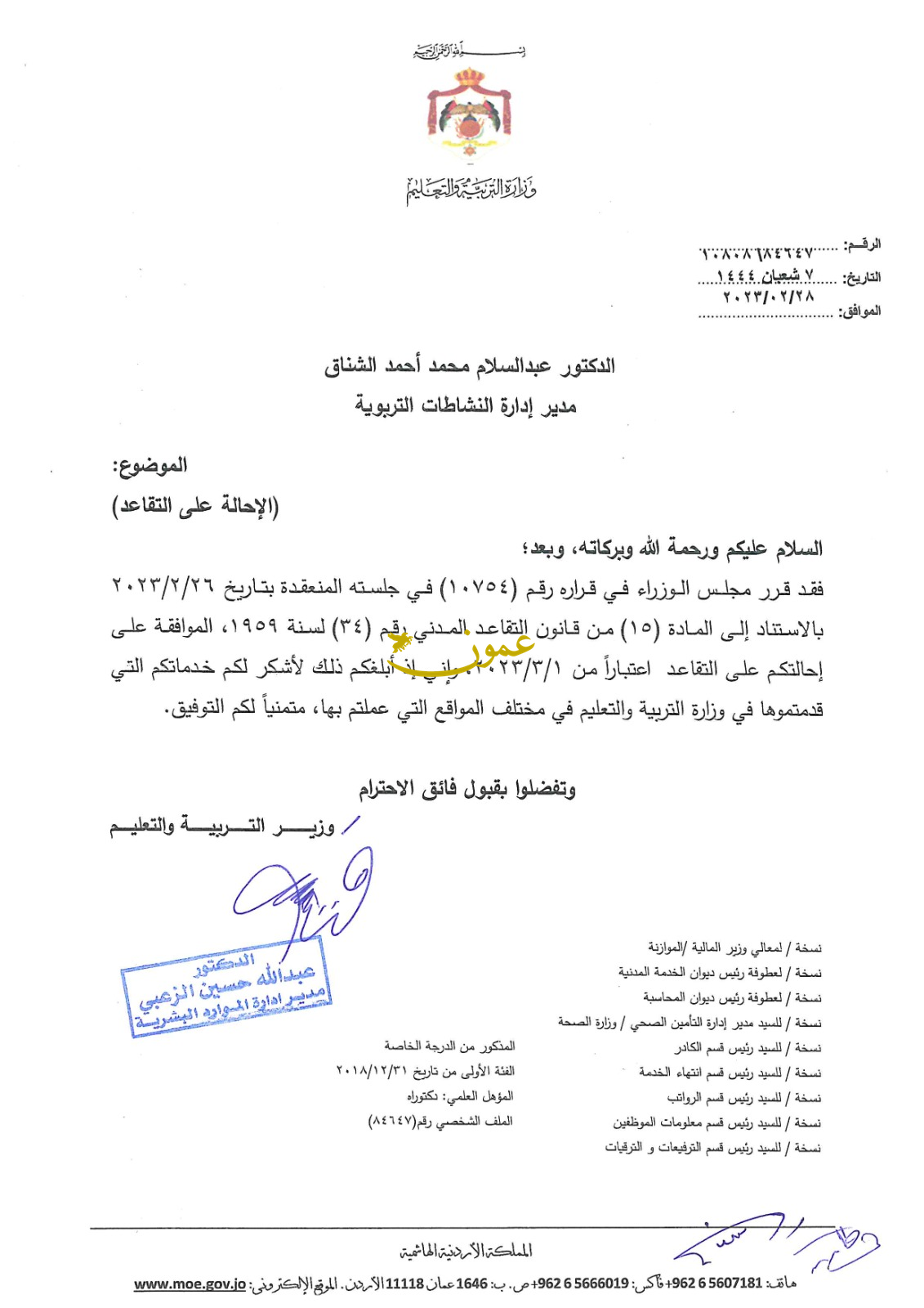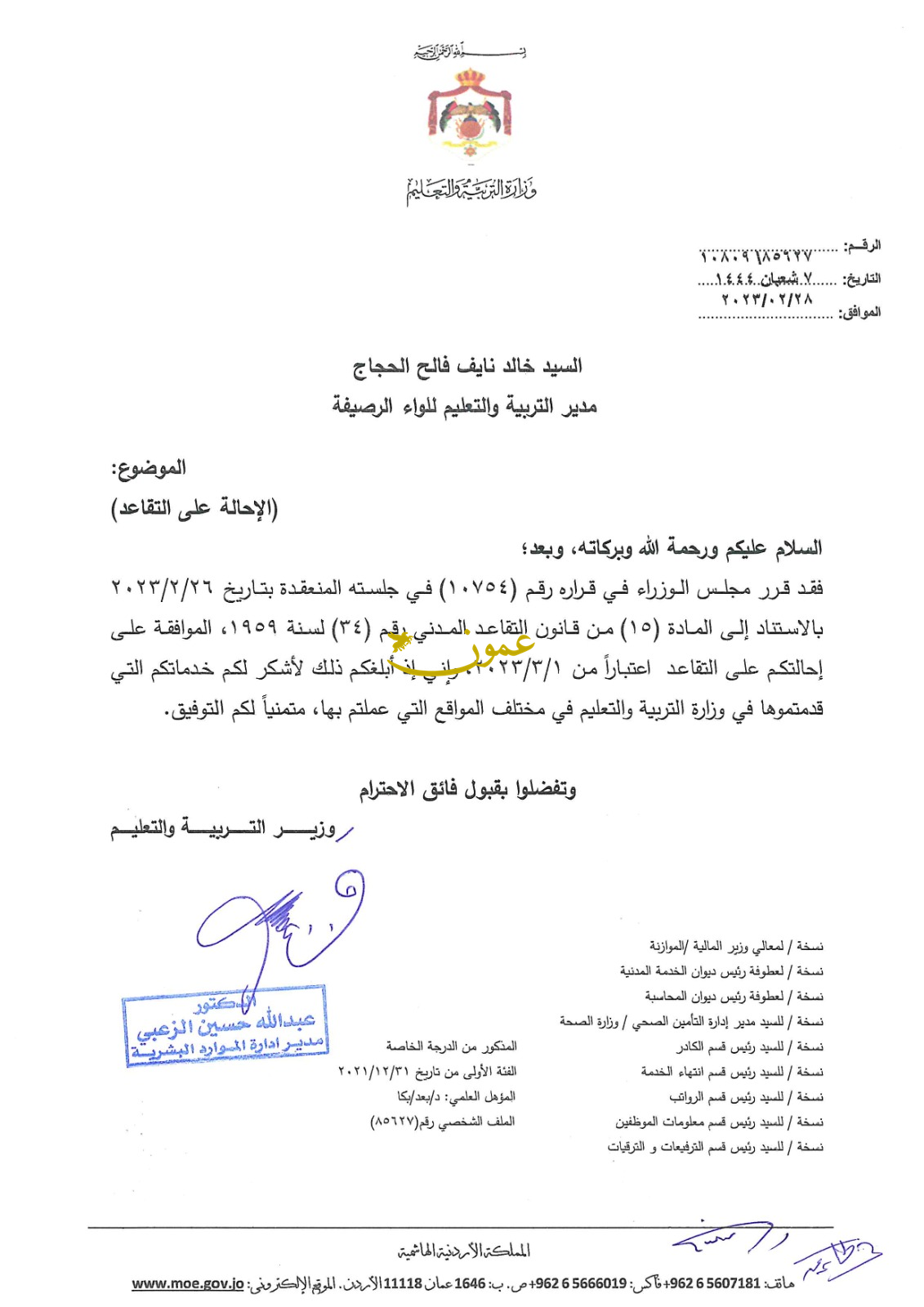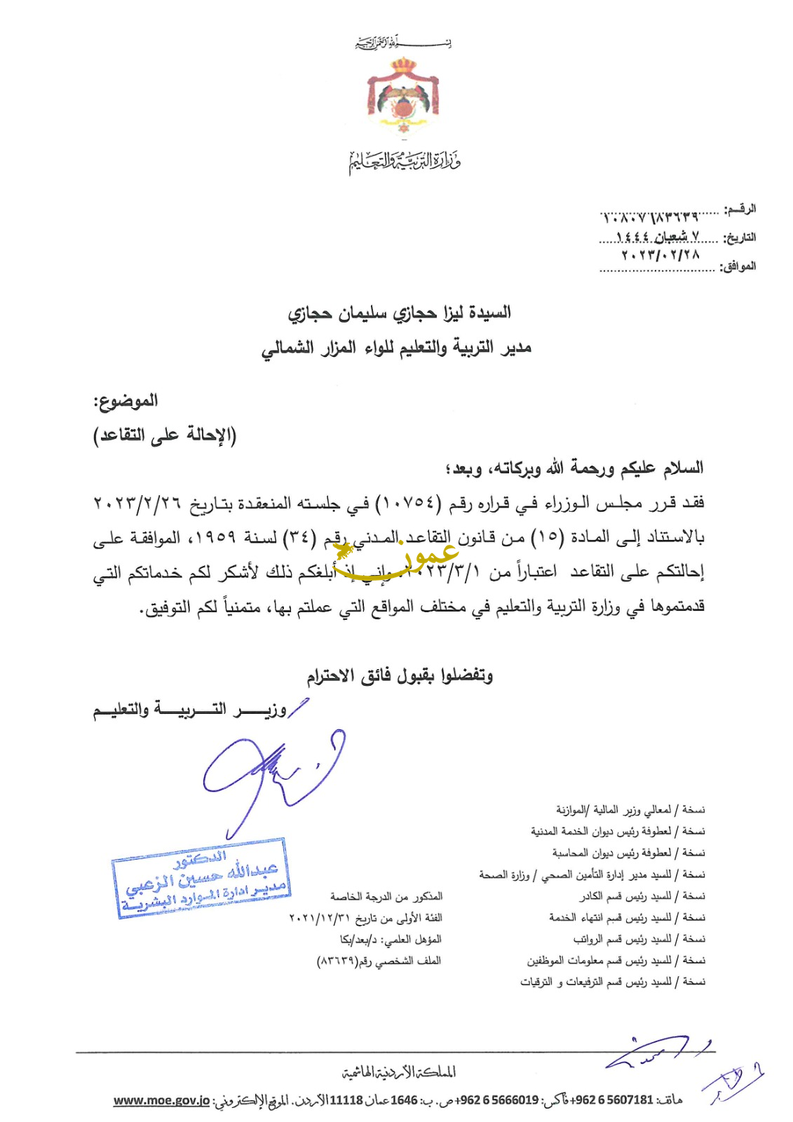 عمون - قرر مجلس الوزراء مؤخرا الموافقة على إحالة عدد من المدراء في وزارة التربية والتعليم إلى التقاعد.