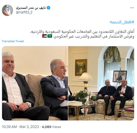 وقال السديري في تغريدة له عبر تويتر، "أفاق التعاون اللامحدود بين الجامعات الحكومية السعودية والاردنية. وفرص الاستثمار في التعليم والتدريب غير الحكومي.".