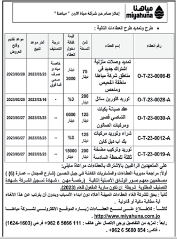 عطاءات صادرة عن شركة مياه الاردن "مياهنا"