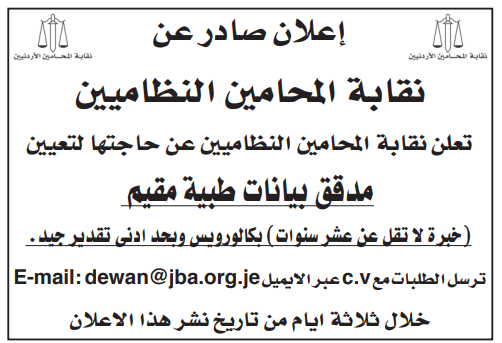 مطلوب مدقق بيانات طبية مقيم لدى نقابة المحامين النظاميين