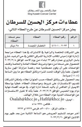 عطاء صادر عن مركز الحسين للسرطان