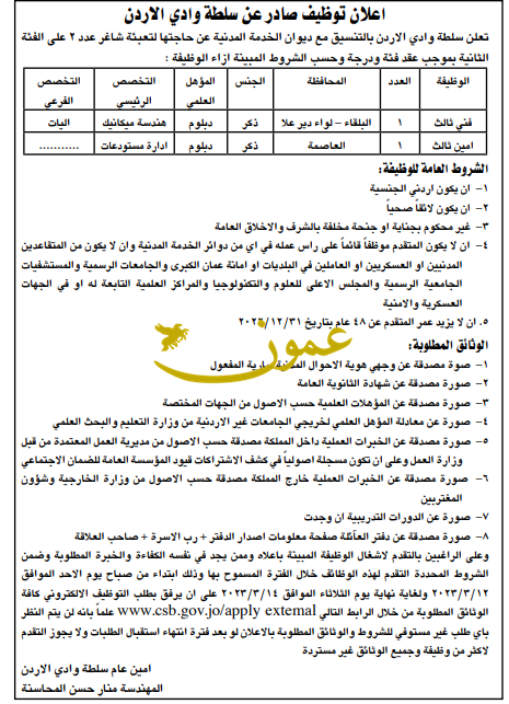 فيما أعلنت سلطة وادي الأردن عن توفر وظائف لديها.