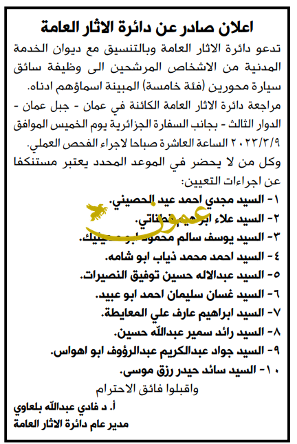 عمون -دعت دائرة الاثار العامة بالتنسيق مع ديوان الخدمة المدنية التالية أسماؤهم لإجراء الفحص الفني لغايات التعيين بوظيفة سائق.