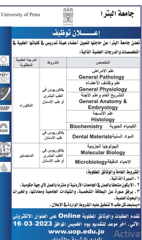 جامعة البترا بحاجة لتعيين اعضاء هيئة تدريسية