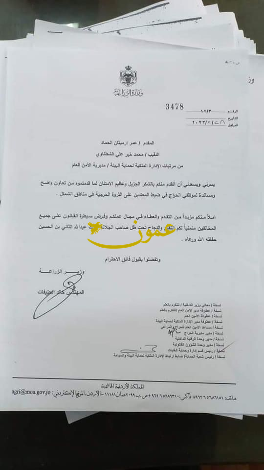 عمون - ينال المعاني - شكر وزير الزراعة المهندس خالد الحنيفات المقدم عمر الحماد والنقيب محمد الشطناوي من مرتبات الإدارة الملكية لحماية البيئة في الامن العام. |