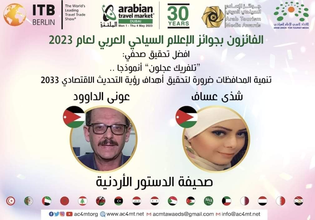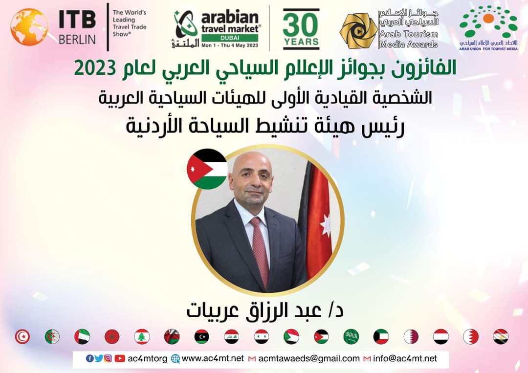 وفاز بجائزة افضل شخصية في الهيئات السياحية العربية مدير عام هيئة تنشيط السياحة الأردنية، الدكتور عبد الرزاق عربيات، فيما فازت شذى عساف وعوني الداوود من صحيفة الدستور، بجائزة افضل تحقيق صحفي سياحي "تحقيق تلفريك عجلون".