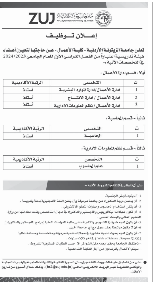 جامعة الزيتونة بحاجة لتعيين اعضاء هيئة تدريسية