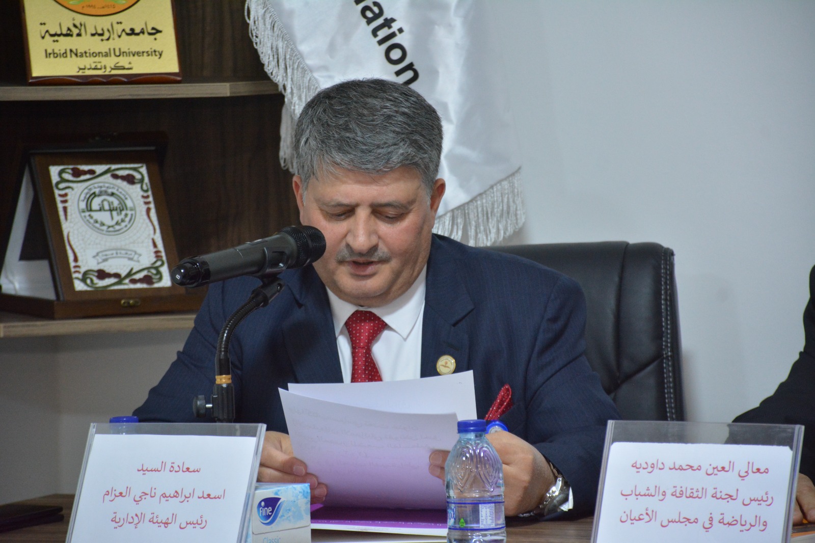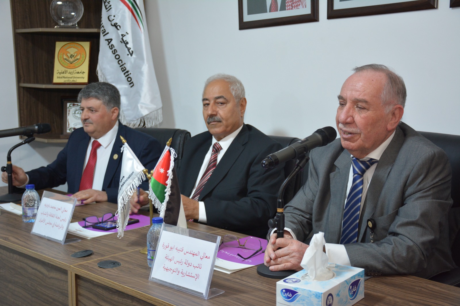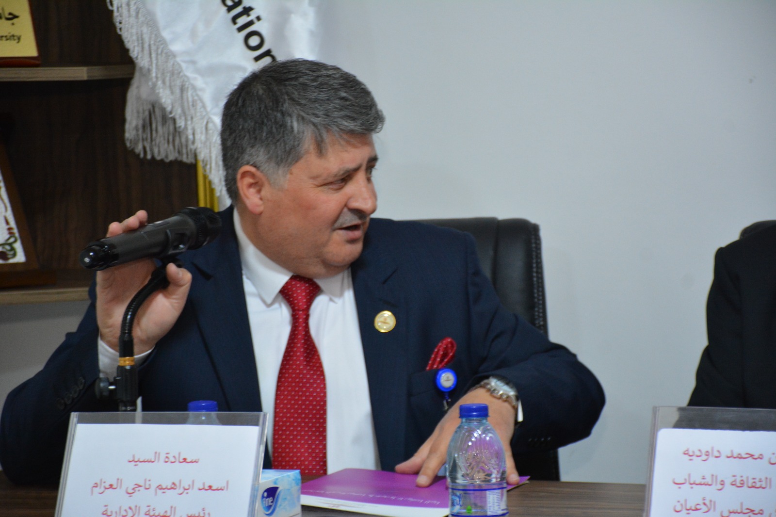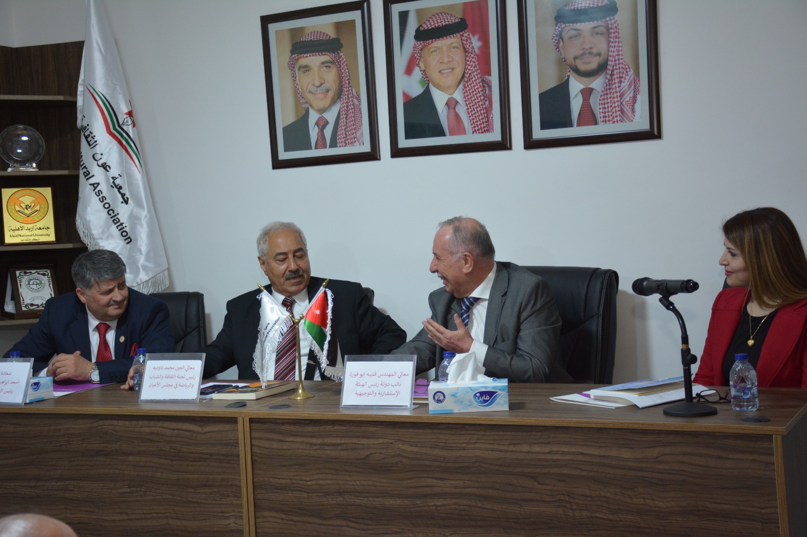 وبدوره قدم رئيس الهيئة الإدارية اسعد ابراهيم ناجي العزام الشكر والعرفان للمهندس قتيبة ابو قوره على رعايته الكريمة لهذه الندوة ورحب بالعين محمد داوديه رئيس لجنة الثقافة والشباب والرياضة في مجلس الأعيان وبالسيدات والسادة الحضور الكرام