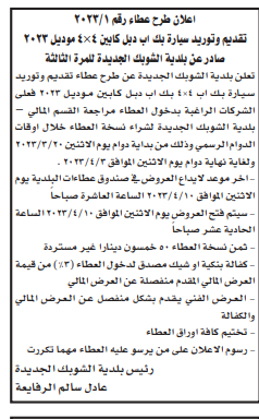 مطلوب شراء بك اب دبل كابين "4×4" لبلدية الشوبك