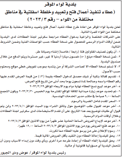 مطلوب تنفيذ اعمال فتح وتعبيد وخلطة اسفلتية لشوارع بلدية الموقر