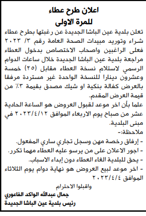 مطلوب شراء مبيدات لبلدية عين الباشا