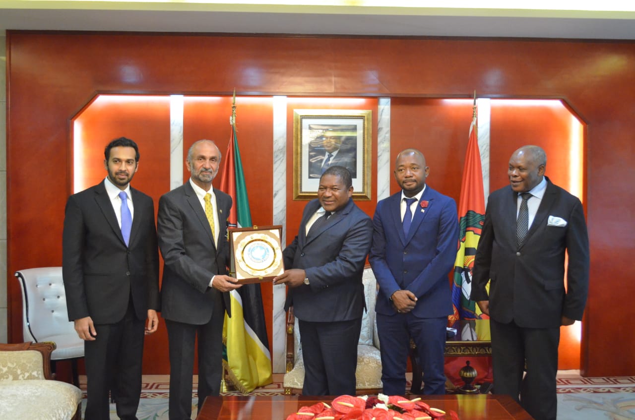 عمون - استقبل فيليبي نيوسي رئيس جمهورية موزمبيق، رئيس المجلس العالمي للتسامح والسلام أحمد بن محمد الجروان والوفد المرافق له في القصر الرئاسي بالعاصمة مابوتو.
