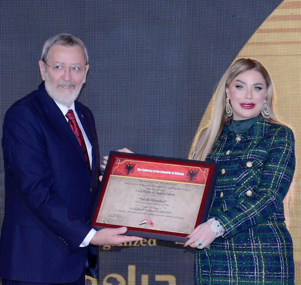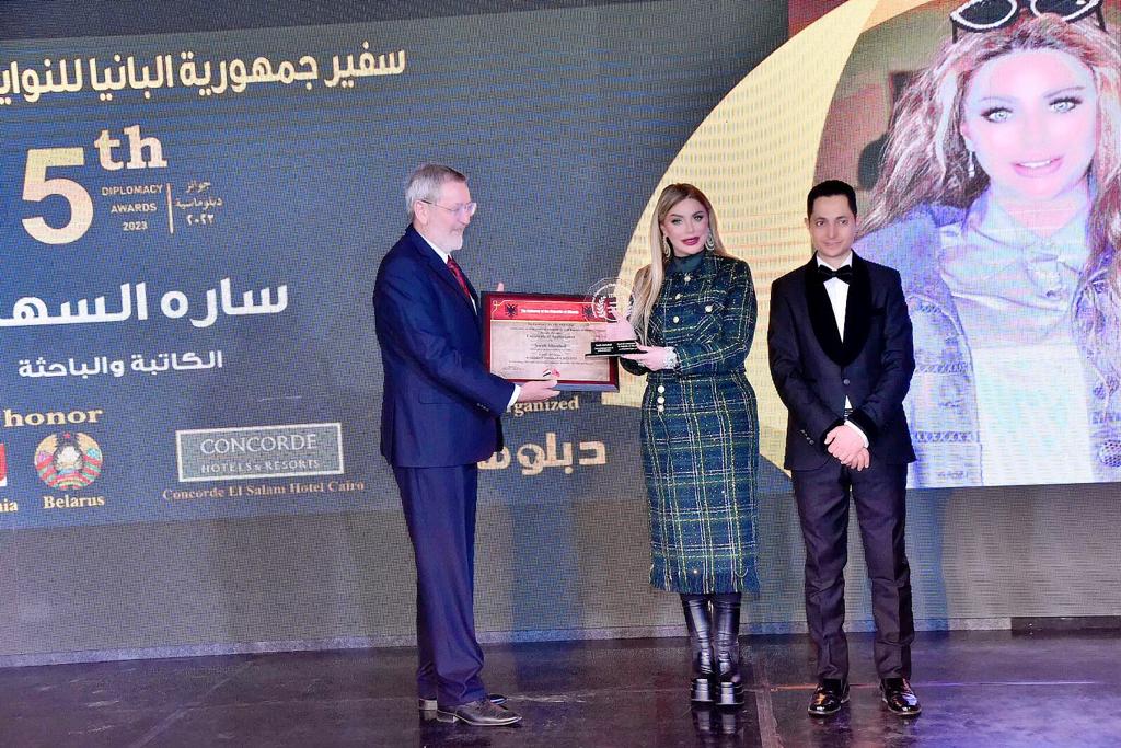 عمون - تسلمت الكاتبة والروائية والباحثة العربية سارة السهيل، جائزة سفيرة البانيا للنوايا الحسنة من السيد سفير جمهورية البانيا بالقاهرة / ادوارد سولو، والرئيس التنفيذي لمجلة الدبلوماسية ورئيس القمة الخامسة السيد/ عبدالحي مختار بحفل توزيع جوائز مجلة الدبلوماسية بمناسبة تنصيبها سفير نوايا الحسنة لهذا العام من دولة البانيا مع عدد من الشخصيات المختارة ورجال الأعمال والدبلوماسيين .