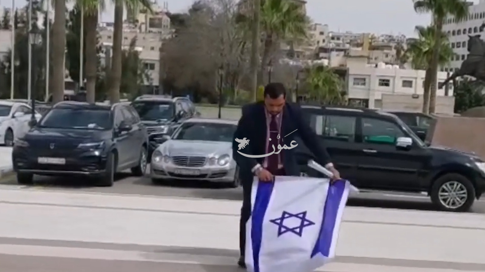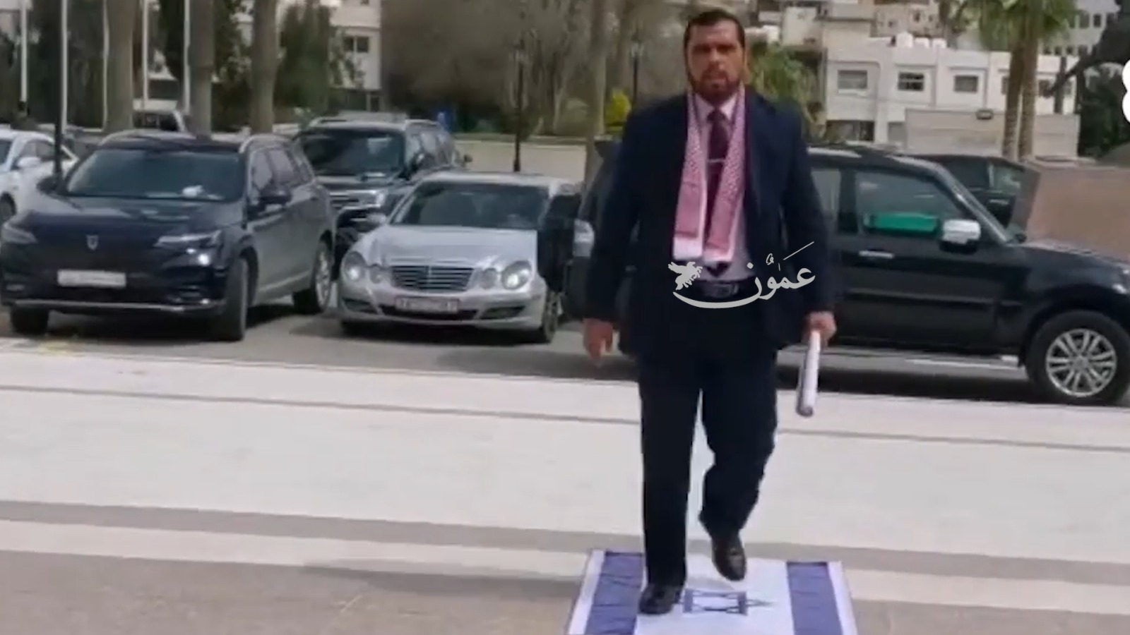 عمون- قام النائب إسماعيل المشاقبة بوضع علم إسرائيل أمام مجلس النواب وداس عليه بقدميه.