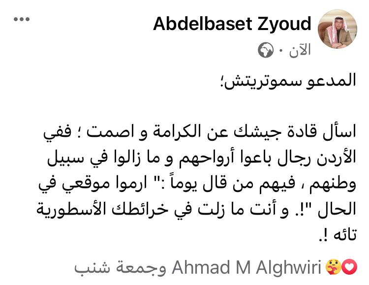 عمون - وجه الدكتور عبدالباسط الزيود، رسالة الى وزير مالية الاحتلال الاسرائيلي سموتريتش، معلقا على تصريحاته وتصرفاته العنصرية ضد الأردن وفلسطين. |