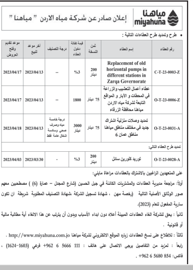 عطاءات صادرة عن شركة مياه الاردن "مياهنا"