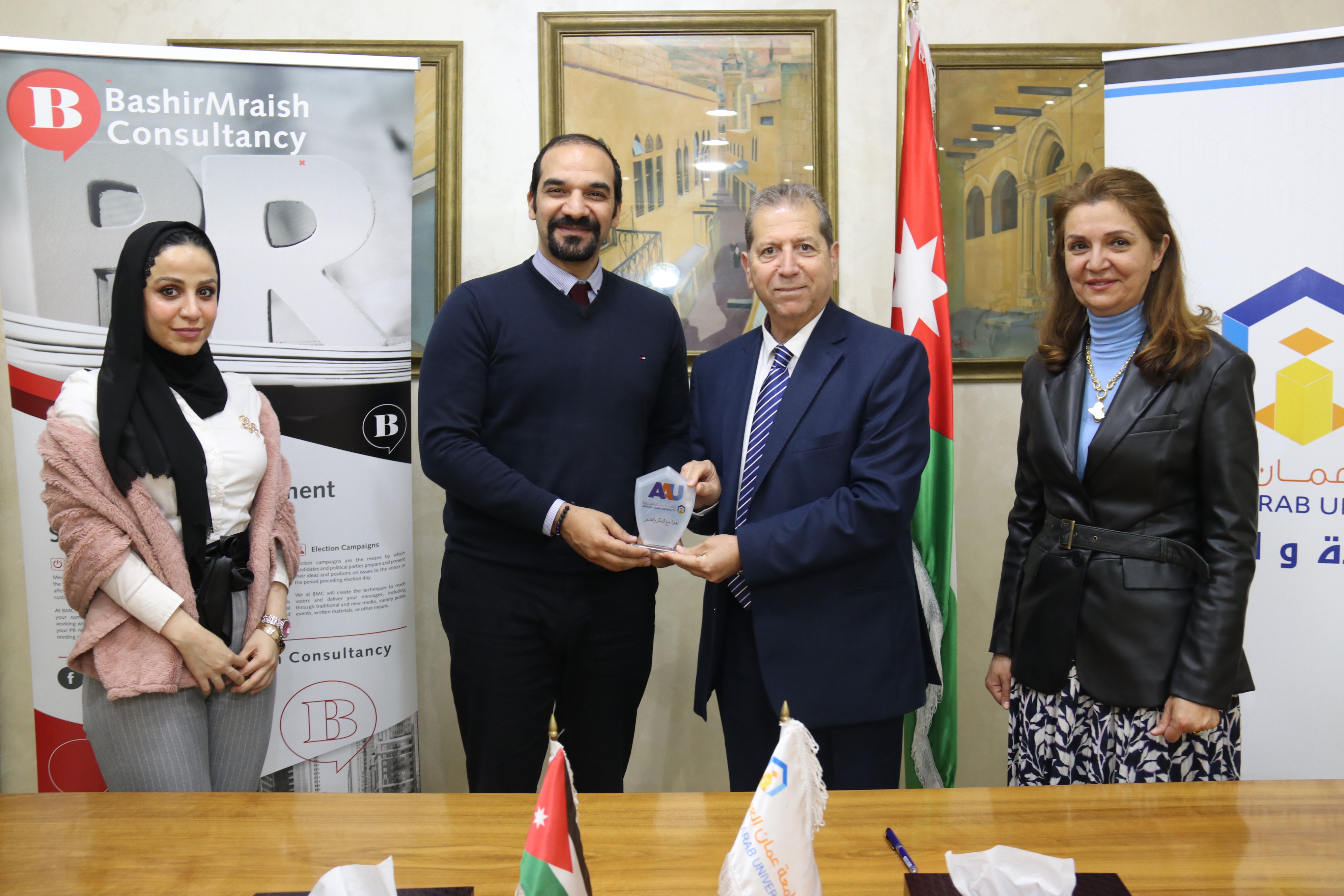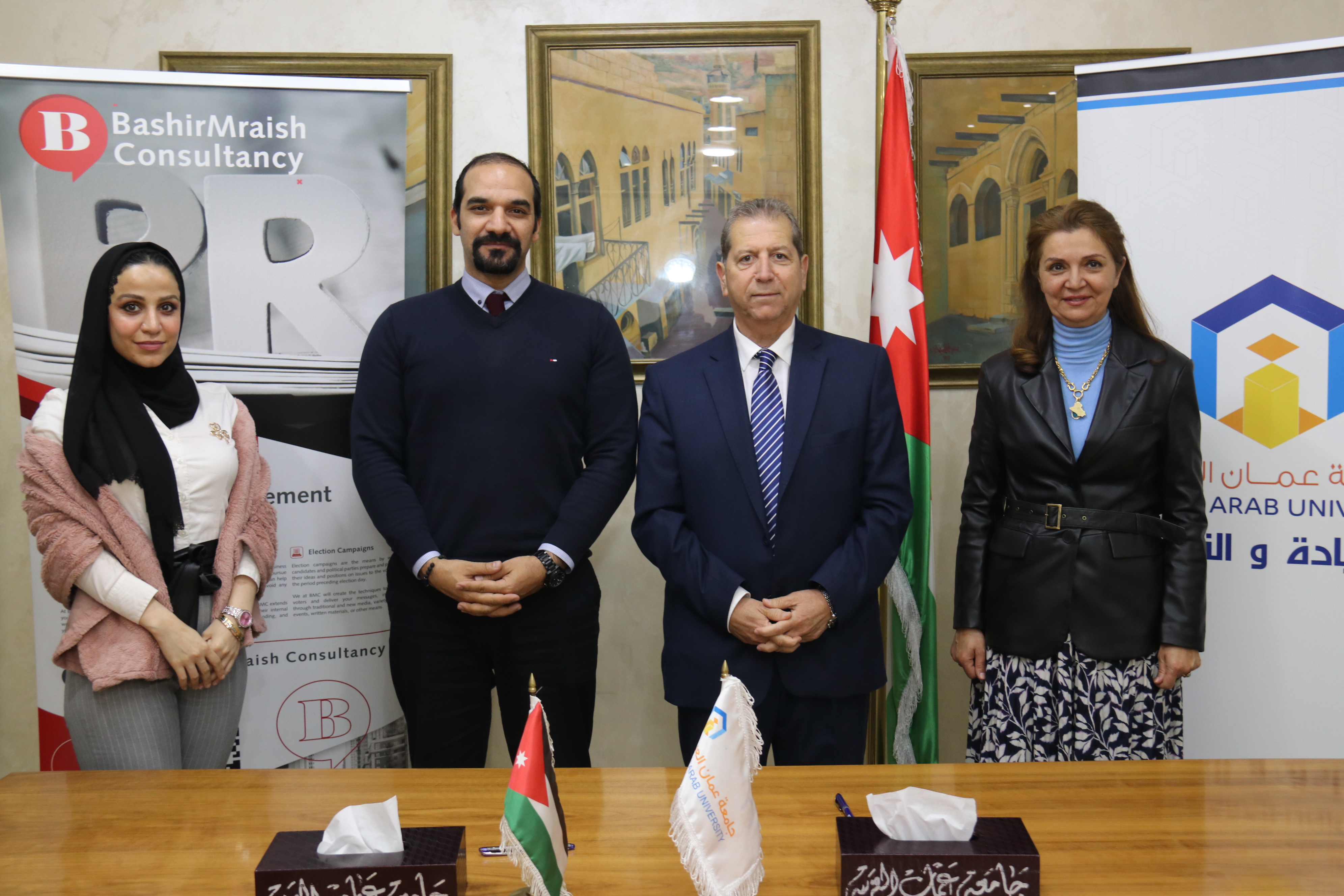 عمون - أبرمت جامعة عمان العربية اتفاقية تعاون مشترك في مجال التدريب والاستشارات مع شركة BMC For Consultations حيث وقع الاتفاقية رئيس الجامعة الأستاذ الدكتور محمد الوديان وعن الشركة السيد بشير مأمون مريش المدير العام بحضور الدكتورة مي الشيخلي مدير مركز الأستشارات والتدريب في الجامعة والأستاذة رنا أبو غوش مدير التدريب بالشركة . |