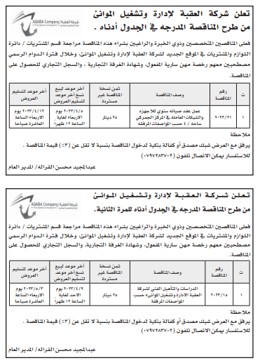 عطاءات صادرة عن شركة العقبة لادارة وتشغيل الموانئ