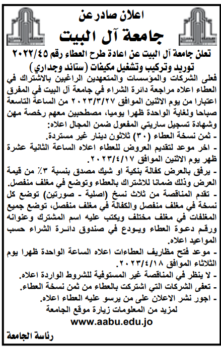مطلوب تركيب وتشغيل مكيفات لجامعة آل البيت