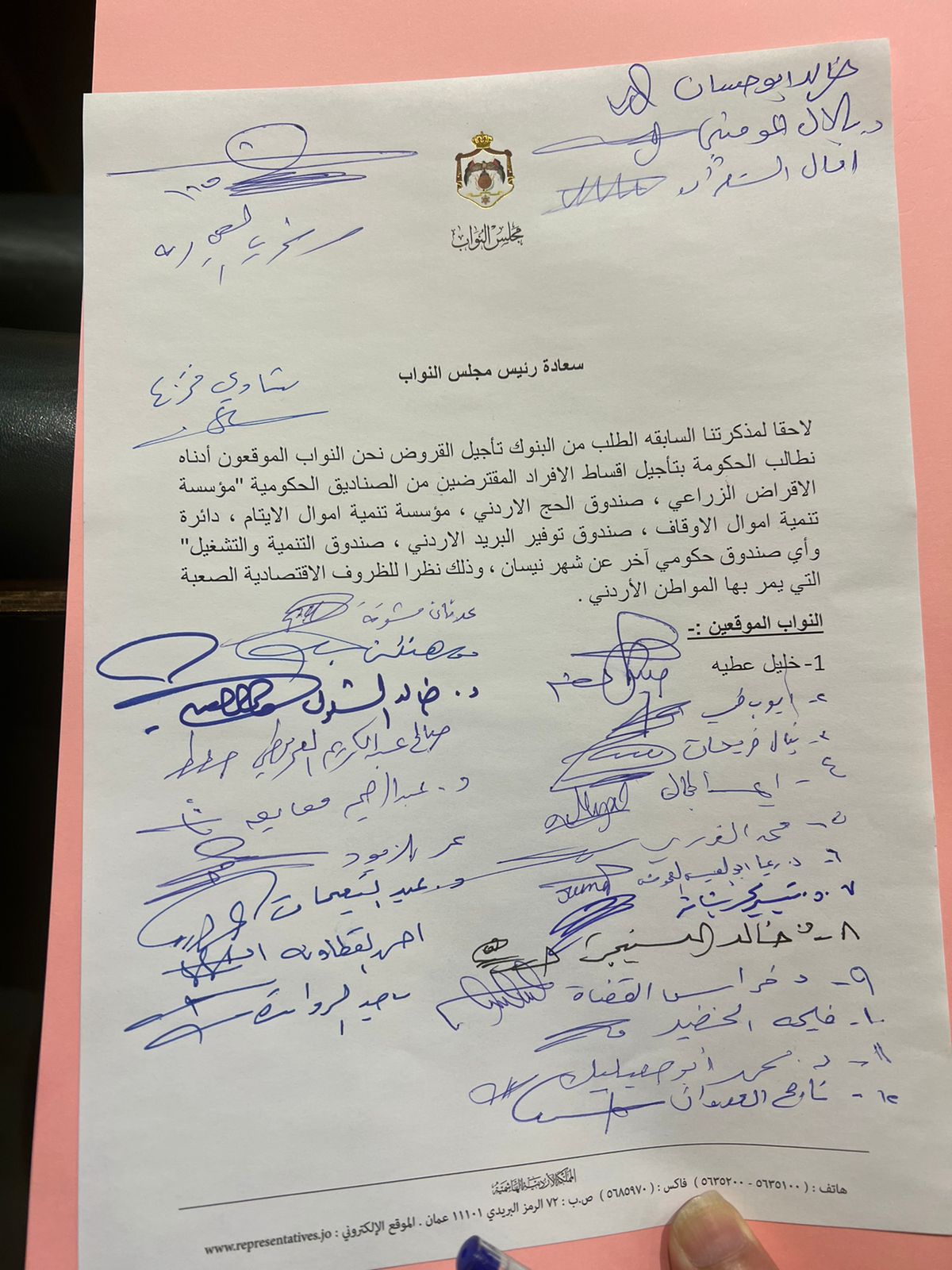 عمون - طالبت مذكرة نيابية تبناها النائب خليل عطية، الحكومة بتأجيل اقساط الافراد المقترضين من الصناديق الحكومية("مؤسسة الاقراض الزراعي، صندوق الحج الاردني، مؤسسة تنمية اموال الايتام، دائرة تنمية اموال الاوقاف، صندوق توفير البريد الاردني، صندوق التنمية والتشغيل) وأي صندوق حكومي آخر عن شهر نيسان. |