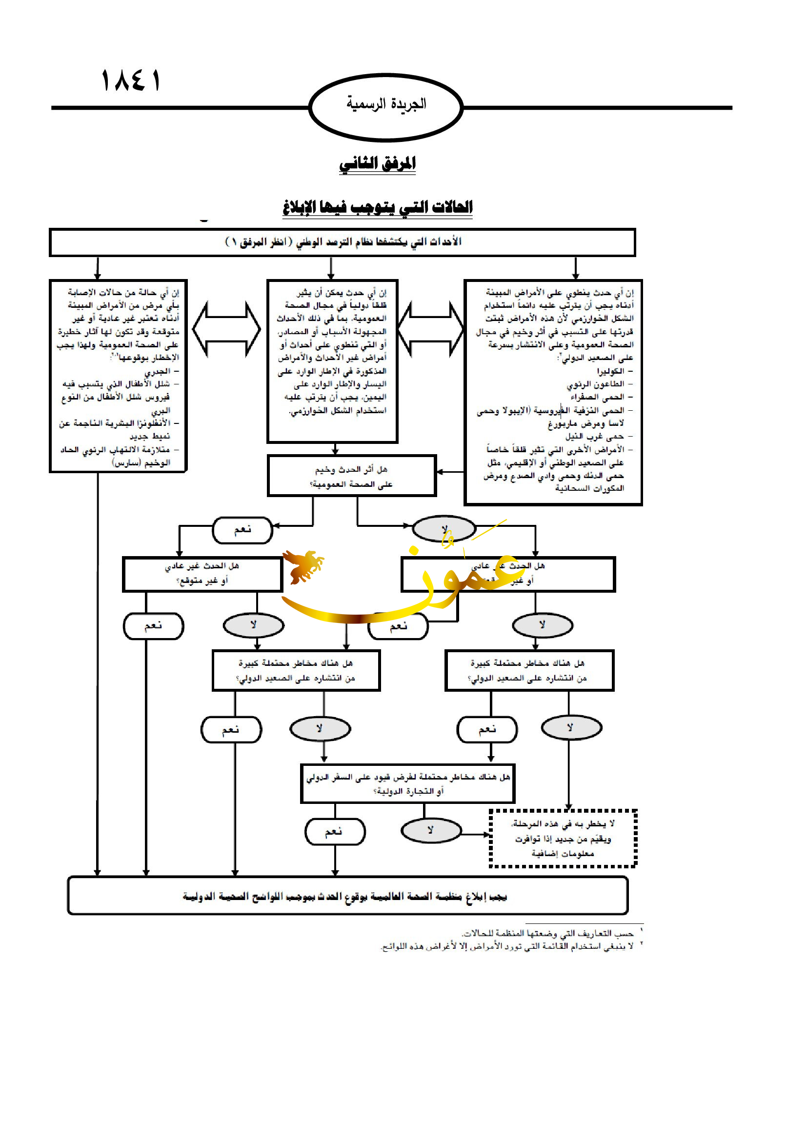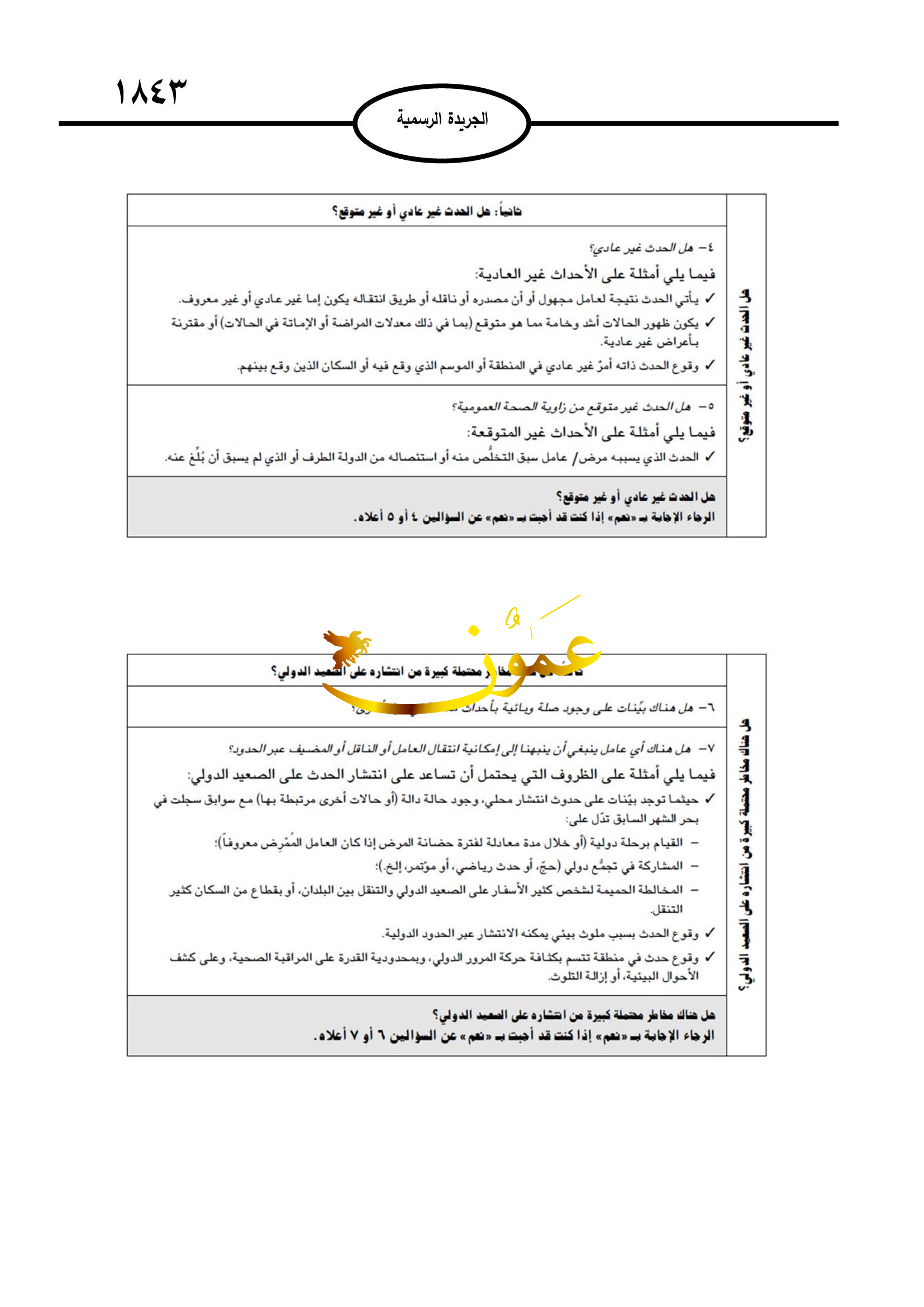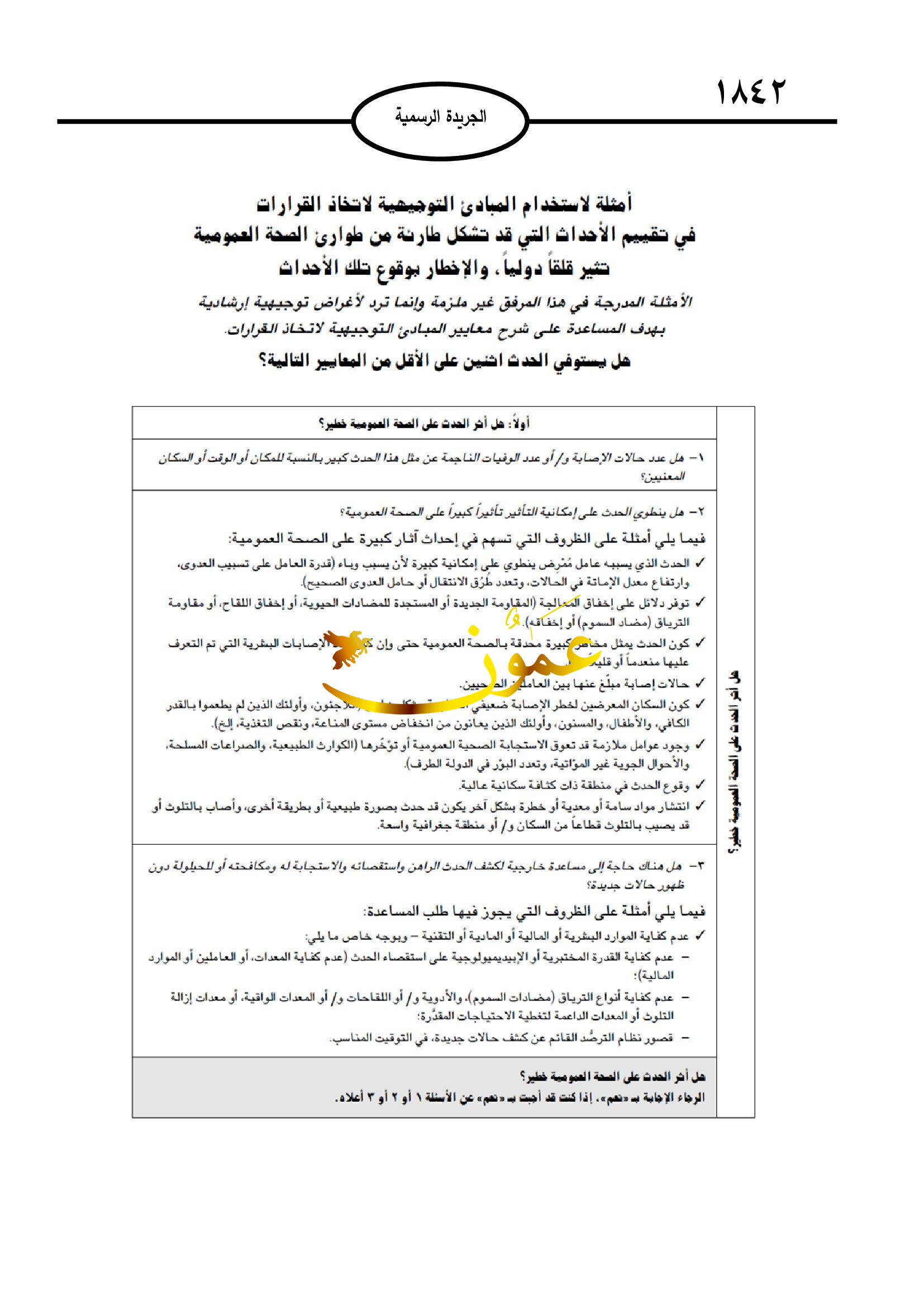 ومن أبرز التعليمات أيضا تقييم الأحداث المتعلقة بالصحة العامة التي تحدث ادخل المملكة والإبلاغ عنها إذا اقتضت الحاجة، وفقا لأحكام هذه التعليمات وعلى النحو المبين في المرفق الثاني بها.