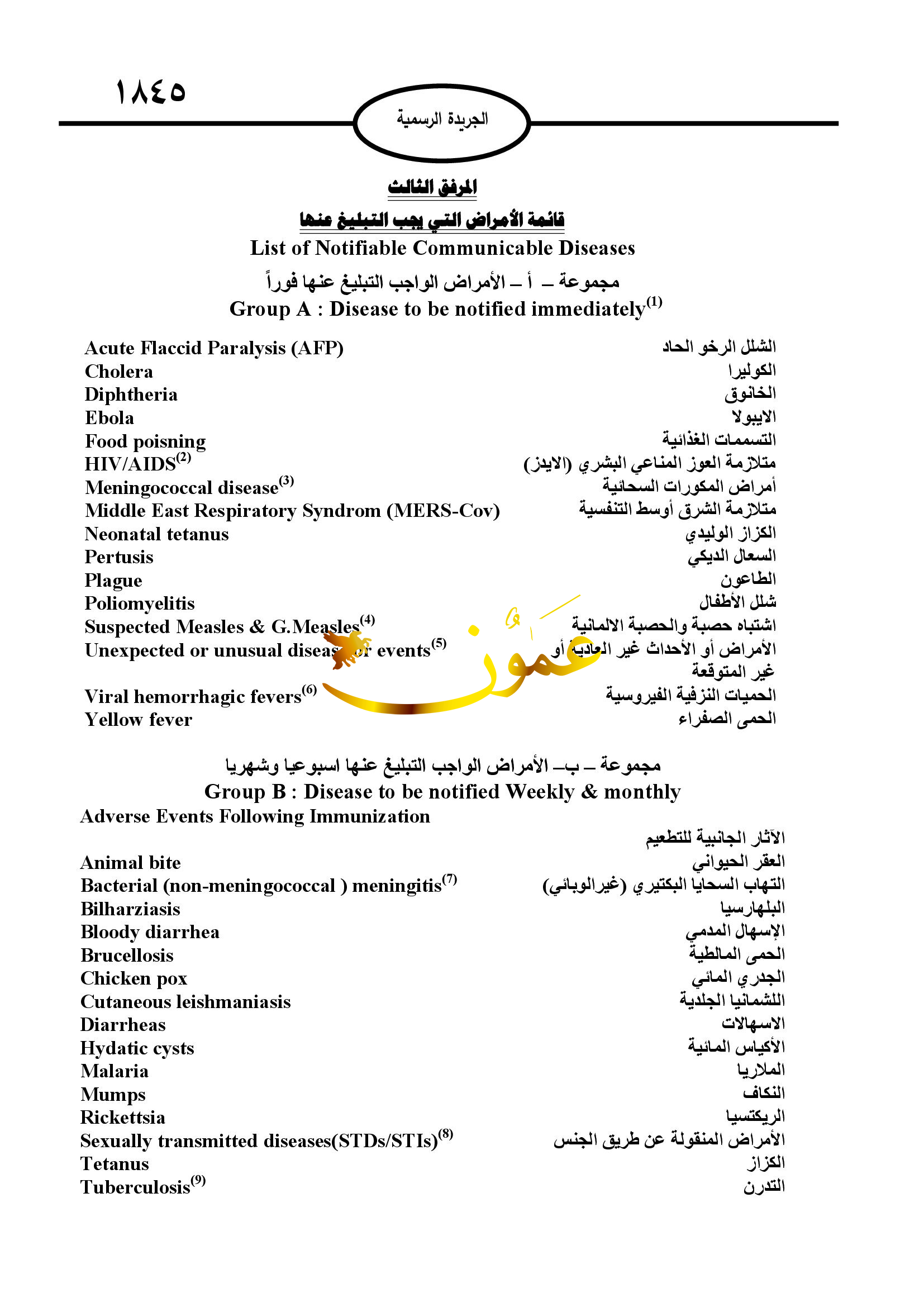 ولوزير الصحة بتنسيب من اللجنة أن يعلن عن المناطق الموبوءة على أن يحدد في الإعلان المكان أو المنطقة التي تفشى فيها المرض المعدي ولوزير الصحة تعديل أو إلغاء الإعلان الصادر بهذا الخصوص.