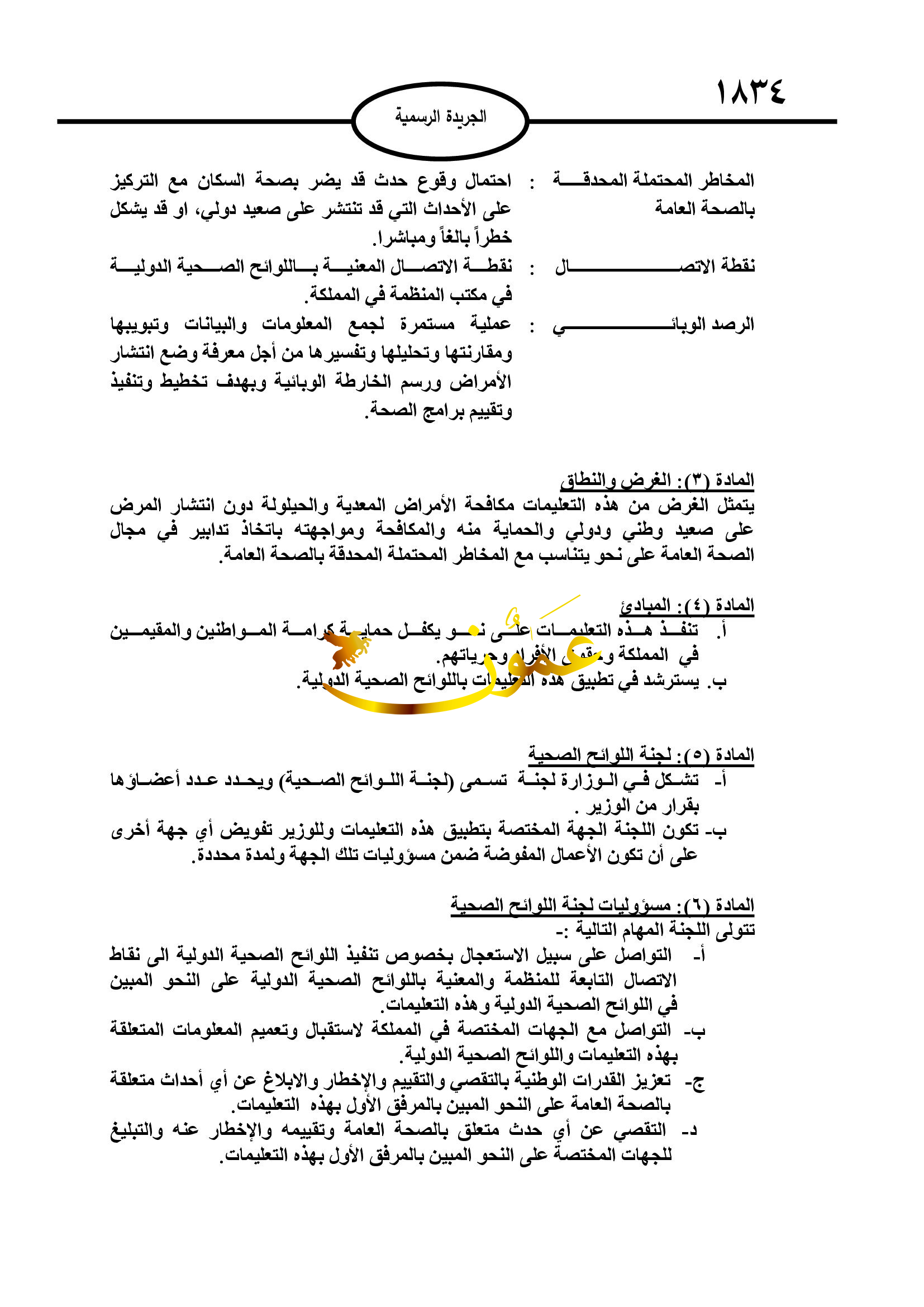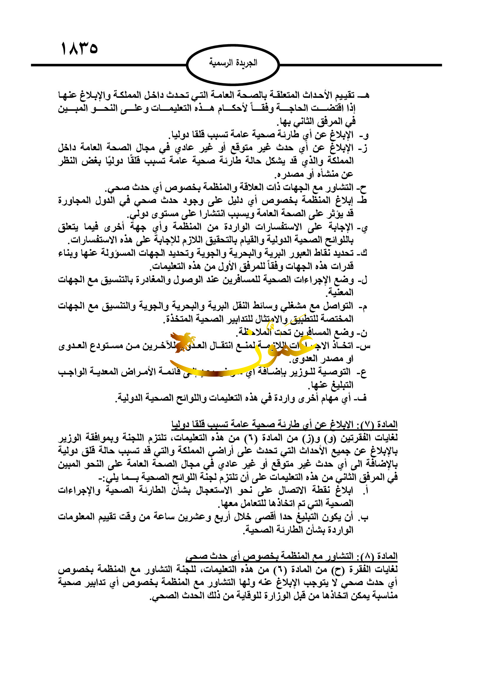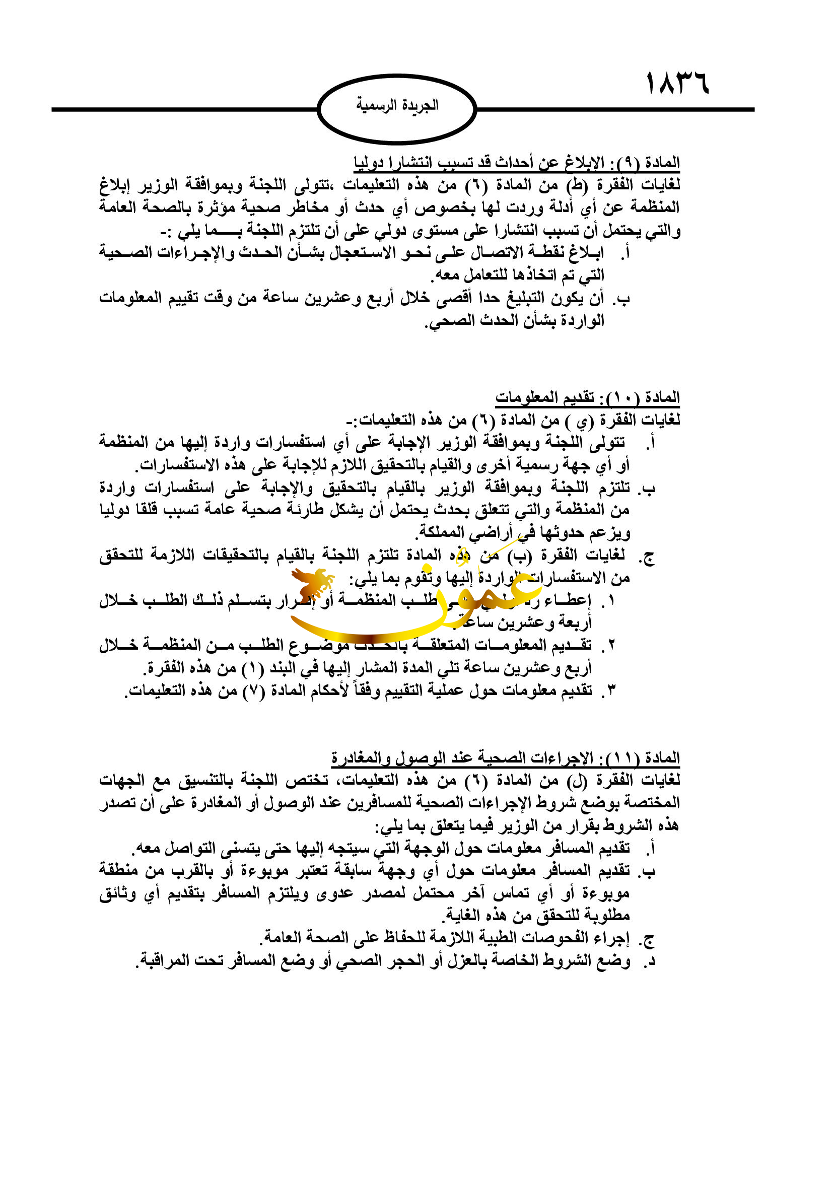 ونصت التعليمات الإبلاغ عن أي طارئة صحية عامة تسبب قلقا دوليا، والإبلاغ عن أي حدث غير متوقع أو غير عادي في مجال الصحة العامة داخل المملكة، والذي قد يشكل حالة طارئة صحية عامة تسبب قلقا دوليا بغض النظر عن منشأه ومصدره، والتشاور مع الجهات ذات العلقة والمنظمة بخصوص أي حدث صحي.