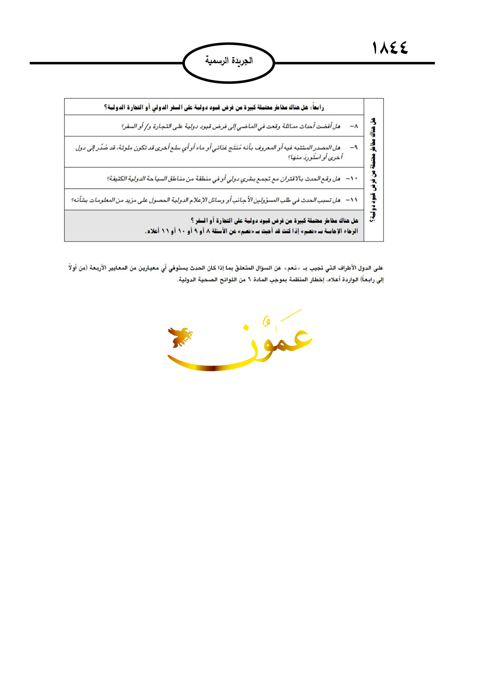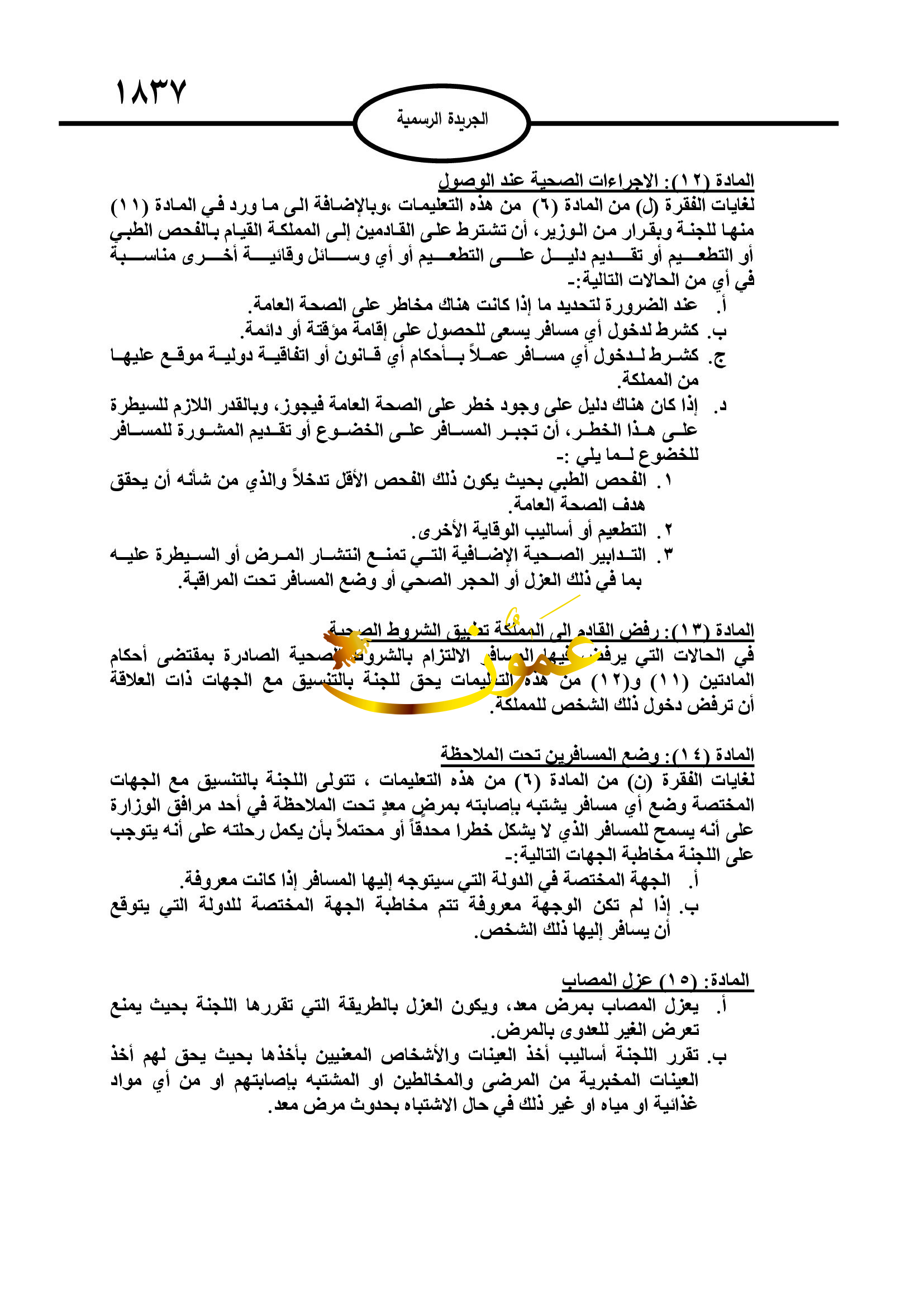 ونوهت التعليمات إلى وضع المسافرين تحت الملاحظة، واتخاذ الإجراءات اللازمة لمنع انتقال العدوى للآخرين من مستودع العدوى أو مصدر العدوى، والتوصية لوزير الصحة بإضافة أي مرض معد إلى قائمة الأمراض المعدية الواجب التبليغ عنها.
