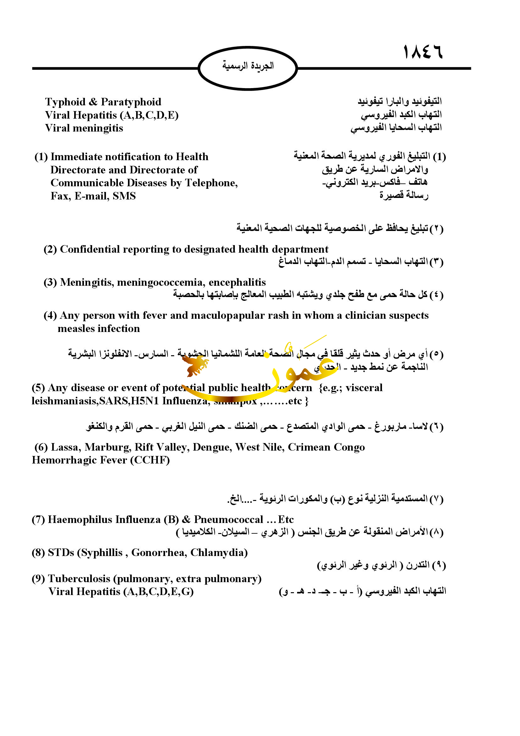 وبينت التعليمات أنه يجب على كل من أشرف أو اشترك من الكوادر الصحية في معالجة أي مصاب بمرض معد أن يبلغ اللجنة مباشرة أو مدير الصحة في منطقته عن الإصابة أو الوفاة بهذا المرض خلال 24 ساعة من حدوثها، وللجنة أن تطل ب من أي طبيب تزويدها بالمعلومات التي لديه عن أي مرض أو إصابة.