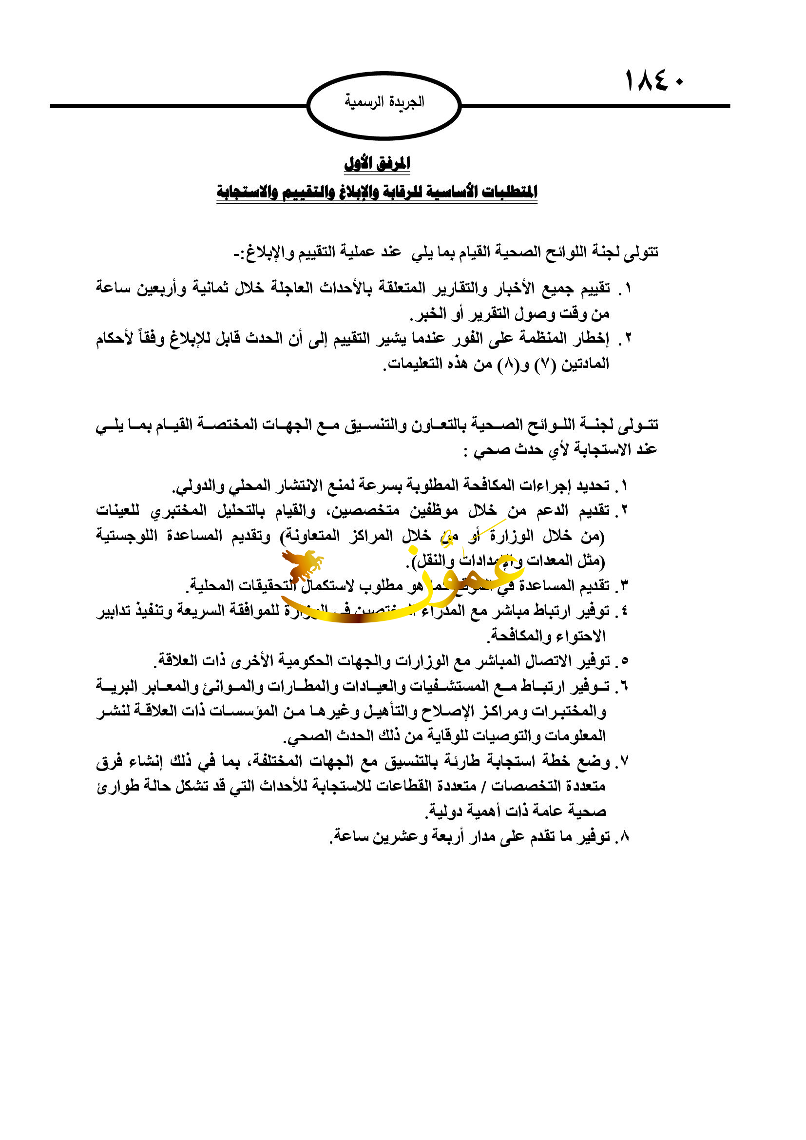 كما تتواصل اللجنة مع الجهات المختصة في المملكة لاستقبال وتعميم المعلومات المتعلقة بهذه التعليمات واللوائح الصحية الدولية، إلى جانب تعزيز القدرات الوطنية بالتقصي والتقييم والإخطار والإبلاغ عن أي أحداث متعلقة بالصحة العامة على النحو المبين بالمرفق الأول بهذه التعليمات، والتقصي عن أي حدث متعلق بالصحة العامة وتقييمه والإخطار عنه والتبليغ للجهات المختصة على النحو المبين بالمرفق الأول لهذه التعليمات.