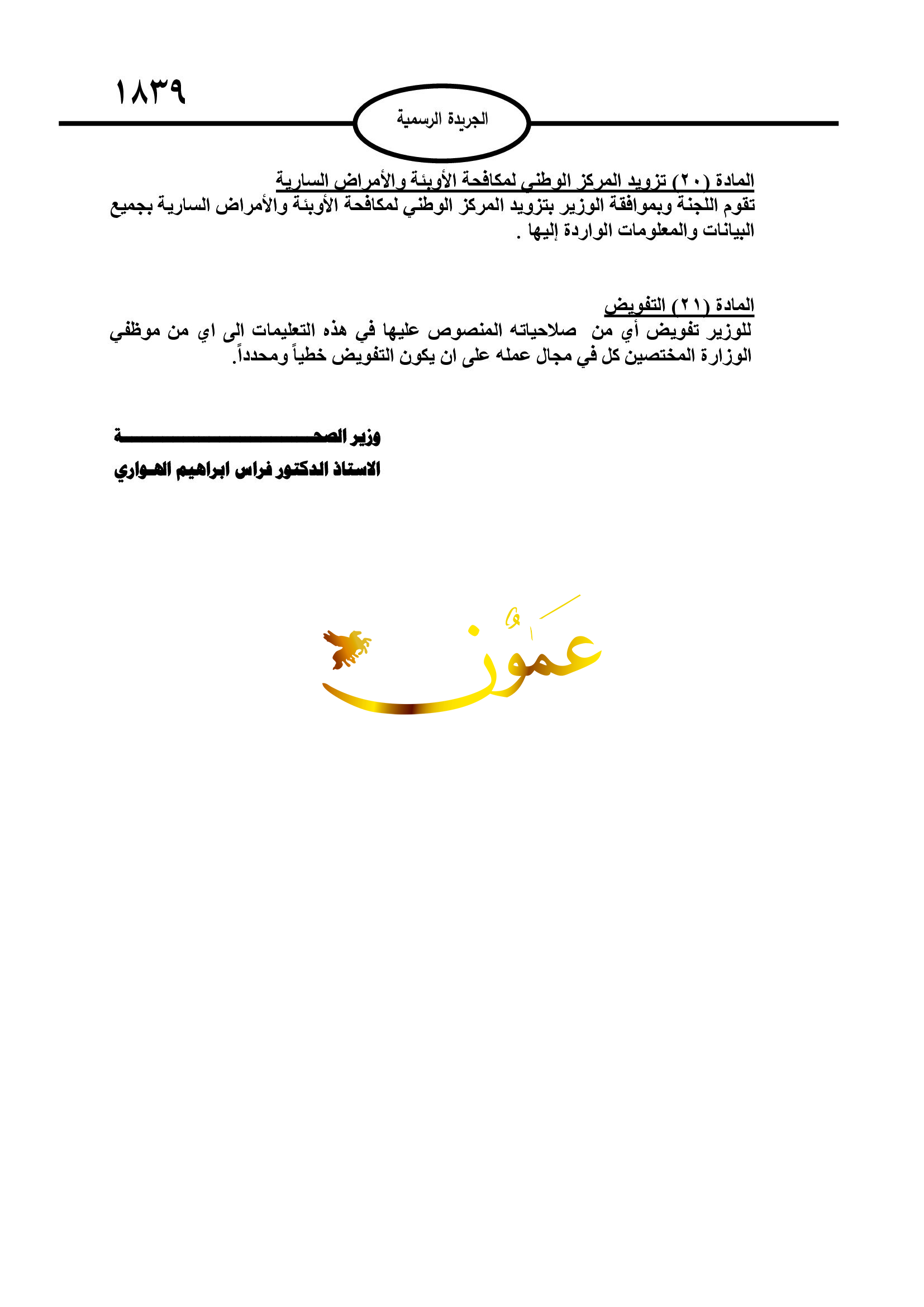 وتقوم اللجنة وبموافقة الوزير على تزويد المركز الوطني لمكافحة الأوبئة والأمراض السارية بجميع البيانات والمعلومات الواردة إليها، ويحق لوزير الصحة تفويض أي من صلاحياته المنصوص عليها في هذه التعليمات إلى أي من موظفي الوزارة المختصين كل في مجال عمله على أن يكون التفويض خطيا ومحددا.