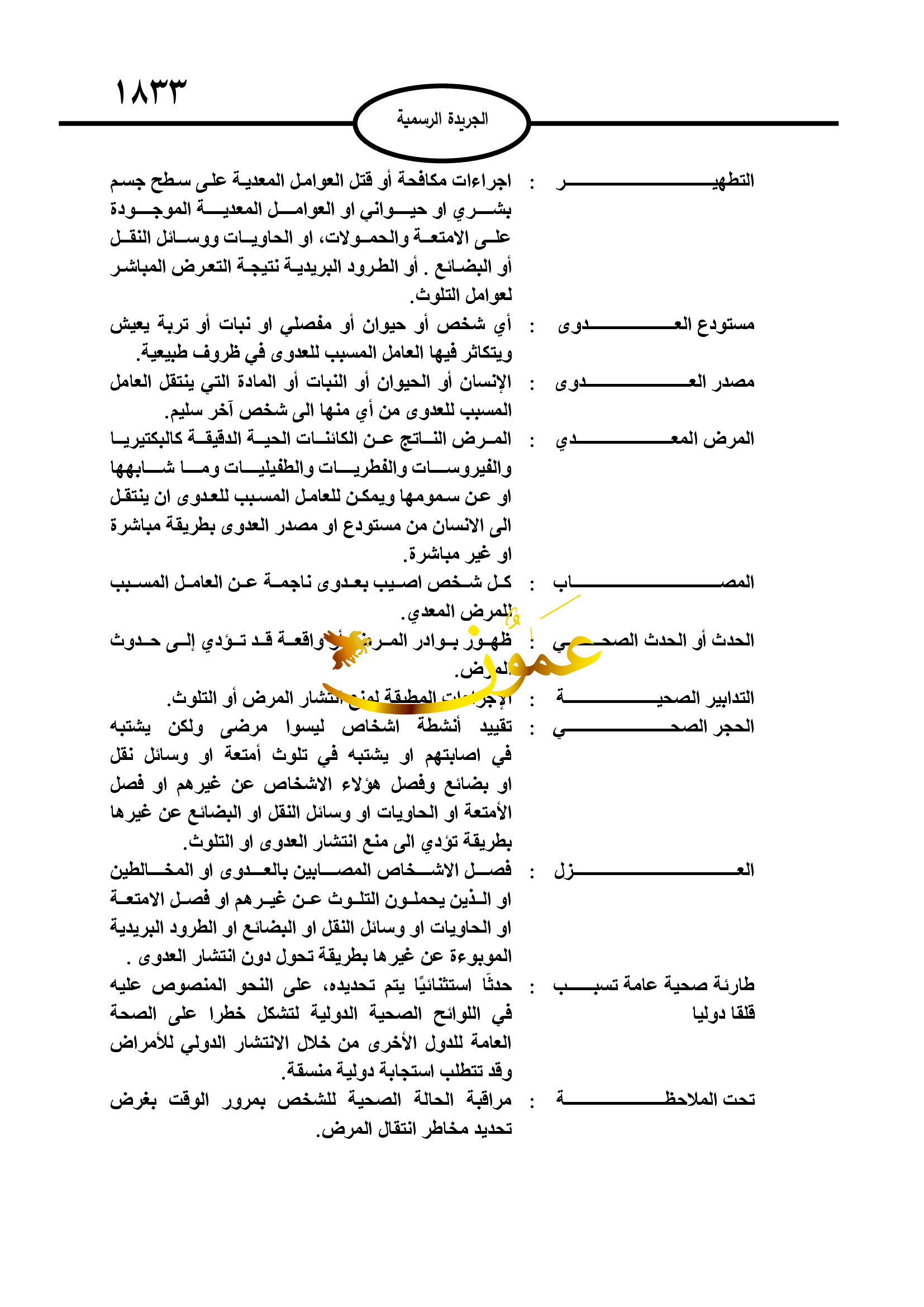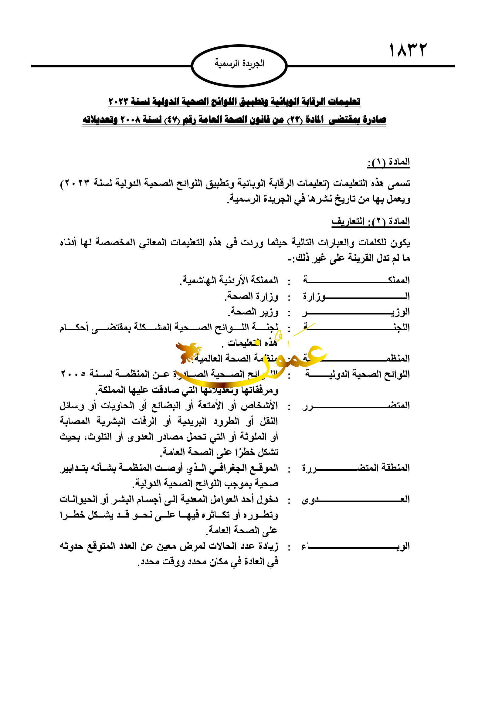 عمون – أصدرت الحكومة، تعليمات الرقابة الوبائية وتطبيق اللوائح الصحية الدولية لسنة 2023، في عدد الجريدة الرسمية الصادرة الأحد.