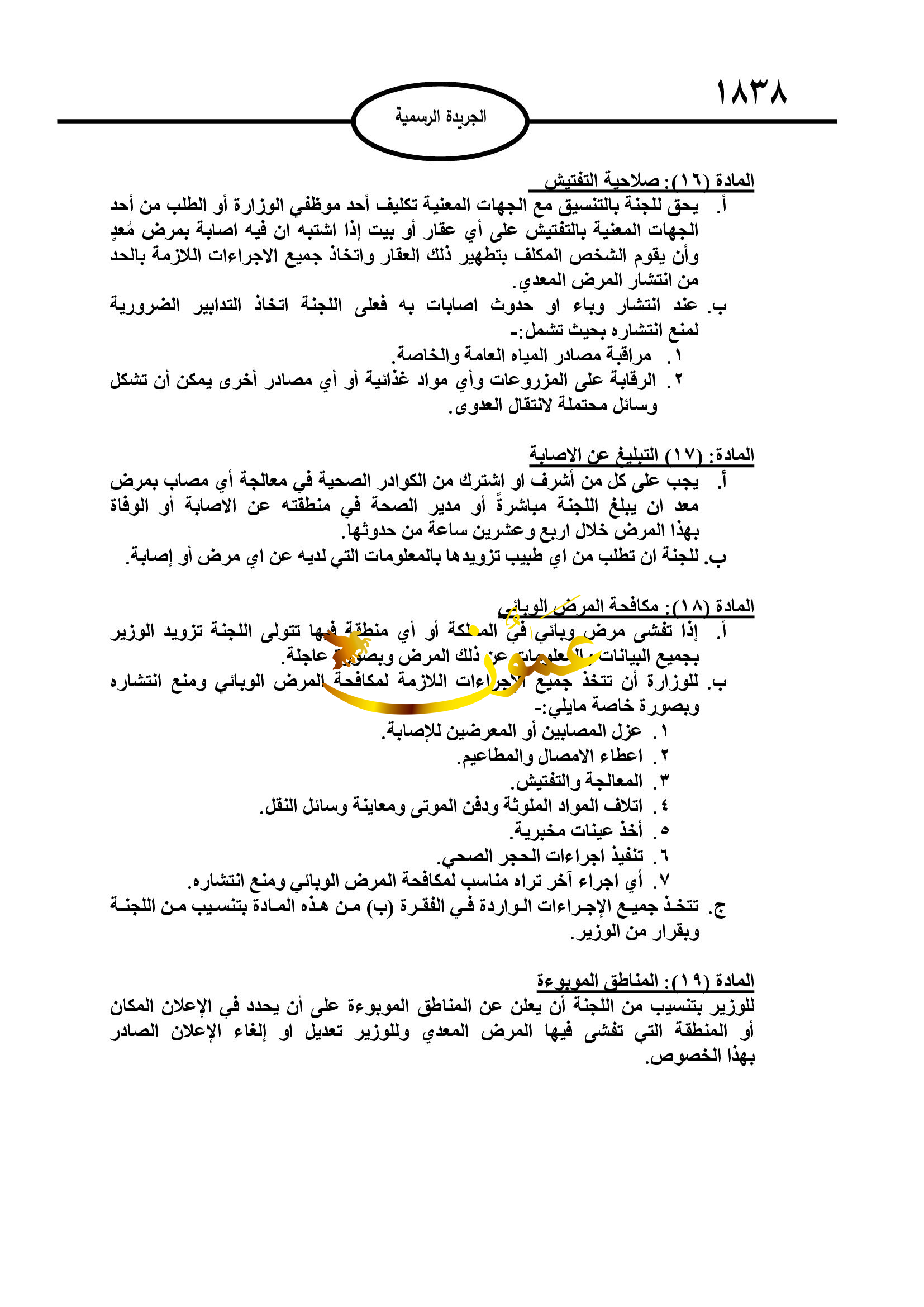 ونصت التعليمات أنه يحق للجنة بالتنسيق مع الجهات المعنية تكليف أحد موظفي الوزارة أو الطلب من أحد الجهات المعنية بالتفتيش على أي عقار أو بيت إذا اشتبه أن فيه إصابة بمرض معد وأن يقوم الشخص المكلف بتطهير ذلك العقار واتخاذ جميع الإجراءات اللازمة بالحد من انتشار المرض المعدي.