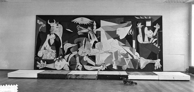1. "غيرنيكا" (بالإنجليزية: Guernica): تُعتبر هذه اللوحة تحفة فنية عالمية معروفة. بمجرد رؤيتها، يمكن للمشاهد التعرف على أنها من أعمال بيكاسو. تُمثل اللوحة الحرب والعنف، وكانت قضية سلم العالم واللاعنف محور اهتمام بيكاسو.