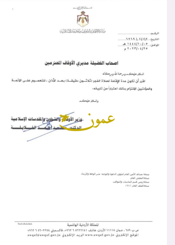 عمون - عمم وزير الأوقاف والمقدسات الإسلامية، الدكتور محمد الخلايلة، الثلاثاء، أن تكون مدة الإقامة لصلاة الفجر 30 دقيقة. |